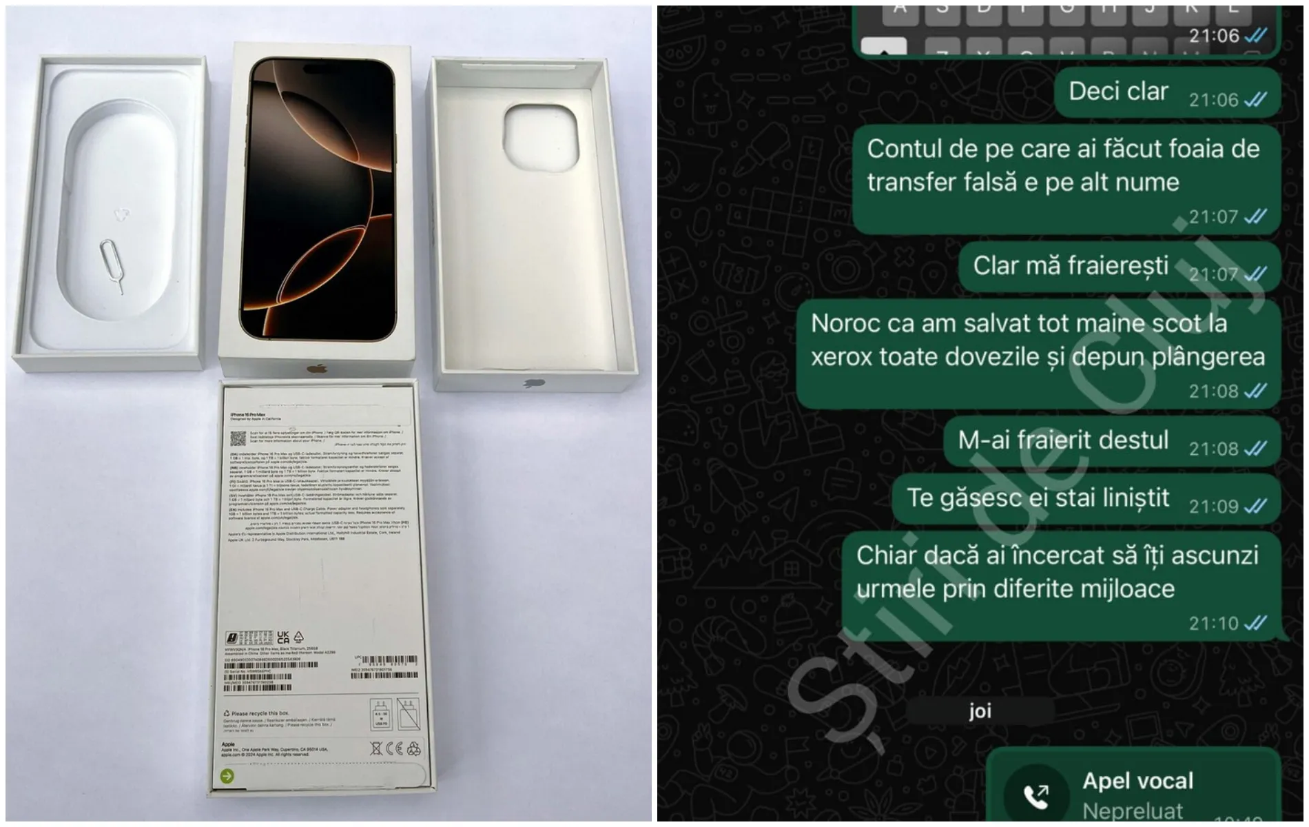 „Am comandat un telefon cu verificare colet pe OLX, sigilat, un iPhone 16 Pro Max, când am verificat funcționa perfect. Am decis să merg să fac transferul de date pe acest telefon, dar la magazin am aflat că e replică. Am primit o hârtie de la magazin, cu toate dovezile am plecat la Poliție, am făcut plângere”, povestește antreprenorul pentru Știri de Cluj.