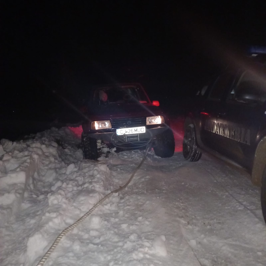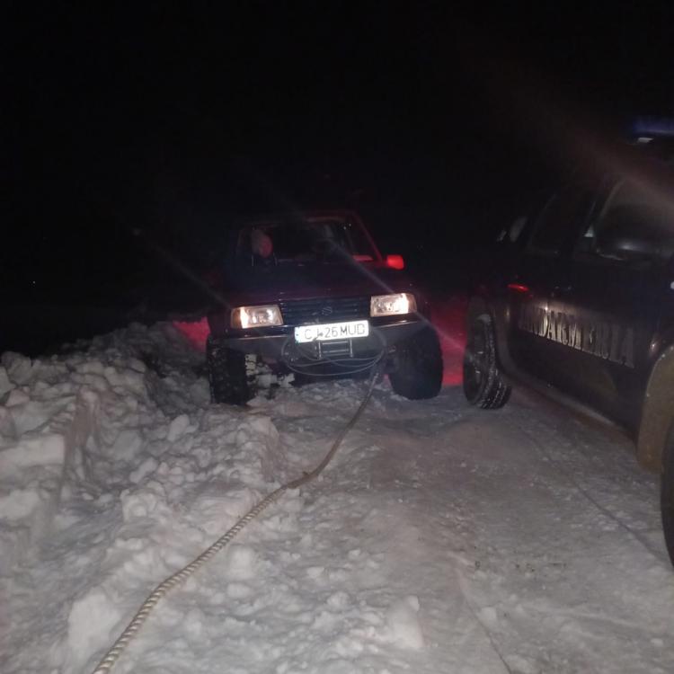 ”Ieri, în jurul orei 18:30, colegii noștri plutonier adjutant Pașca Adrian și plutonier Petruse Andrei din cadrul Postului de Jandarmi Montan Arieșeni, au fost solicitați prin apel la 112, să intervină pe drumul spre Vârful Bihor, pentru a ajuta la scoaterea unui autoturism din zăpadă”, se arată într-un comunicat al Jandarmeriei.
