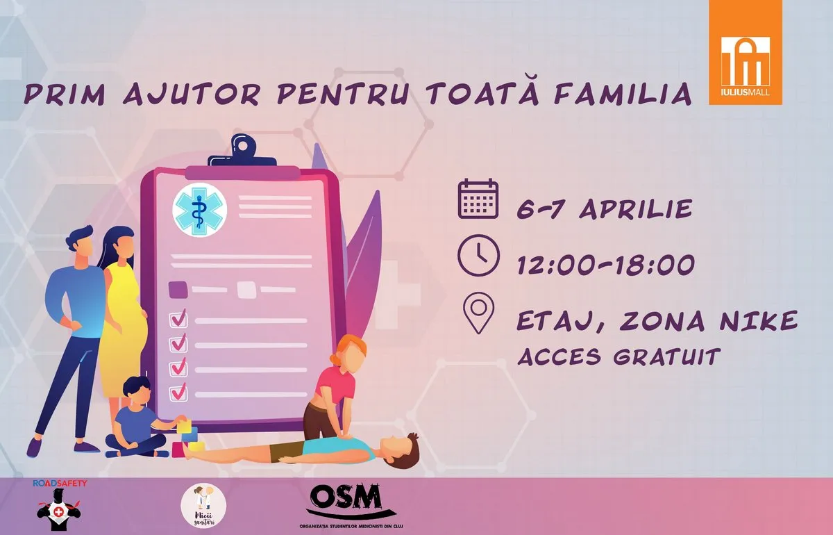 Sâmbătă şi duminică, 6 şi 7 aprilie 2024, de la ora 12:00, la etajul 1 din Iulius Mall vor fi organizate cursuri de prim ajutor pentru toată familia. Activitatea face parte din proiectele Road Safety și Micii Sanitari, implementate de Organizația Studenților Mediciniști din Cluj-Napoca.