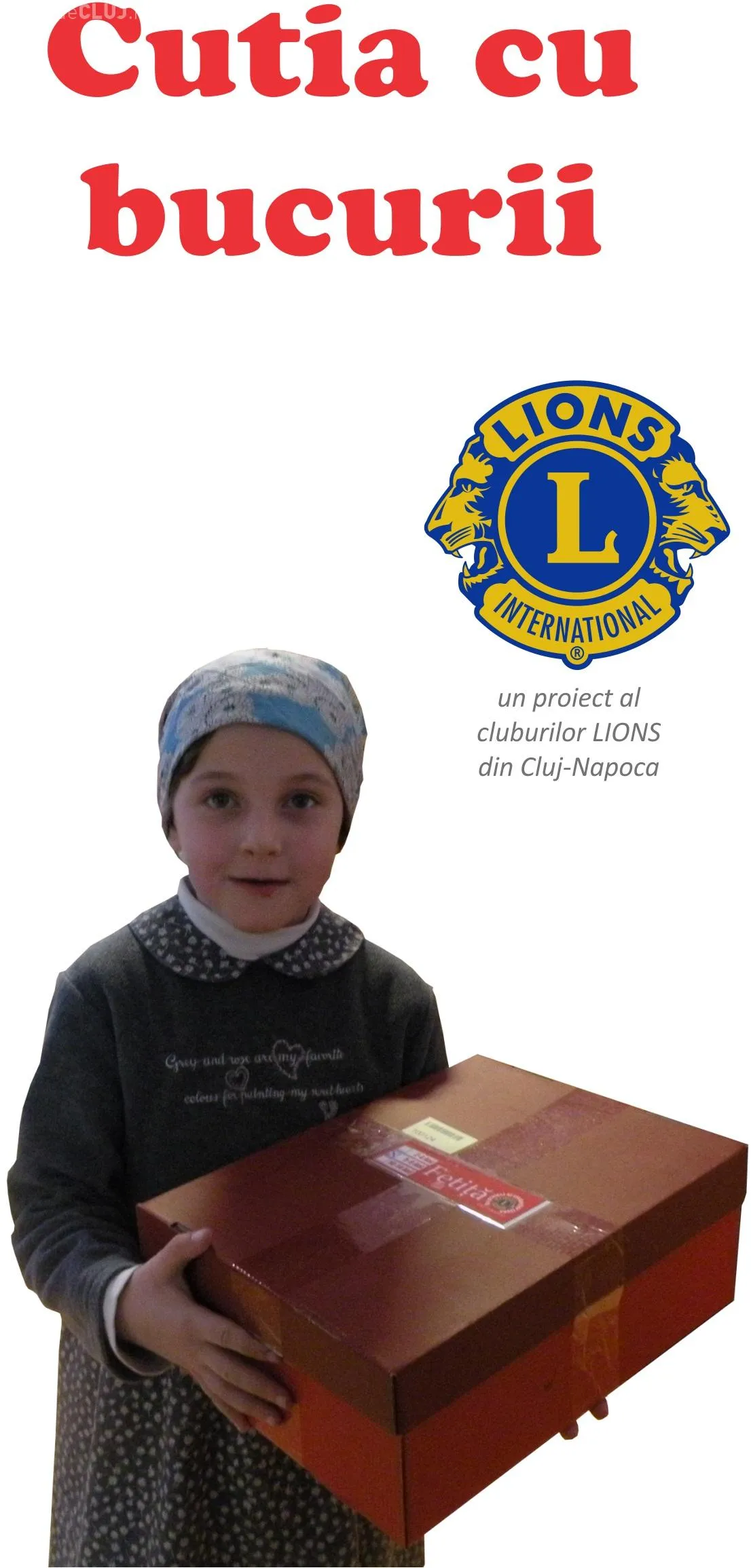 ”Oricine, printr-un efort minim, poate face un copil fericit. Tot ce trebuie sa faceti este sa luati o cutie de carton (de la o pereche de pantofi sau de dimensiuni similare) si sa o umpleti cu lucruri noi, lucruri care credeti ca ar face un copil fericit. Cutiile cu bucurii vor fi livrate copiilor din satele de munte ale judetului Cluj, dupa data de 10 decembrie, de catre membrii cluburilor Lions din Cluj-Napoca. Pentru orice alte detalii scrieti-ne la adresa de mail: cutiacubucurii@lionsclubs.ro”, conform cutiacubucurii.info.