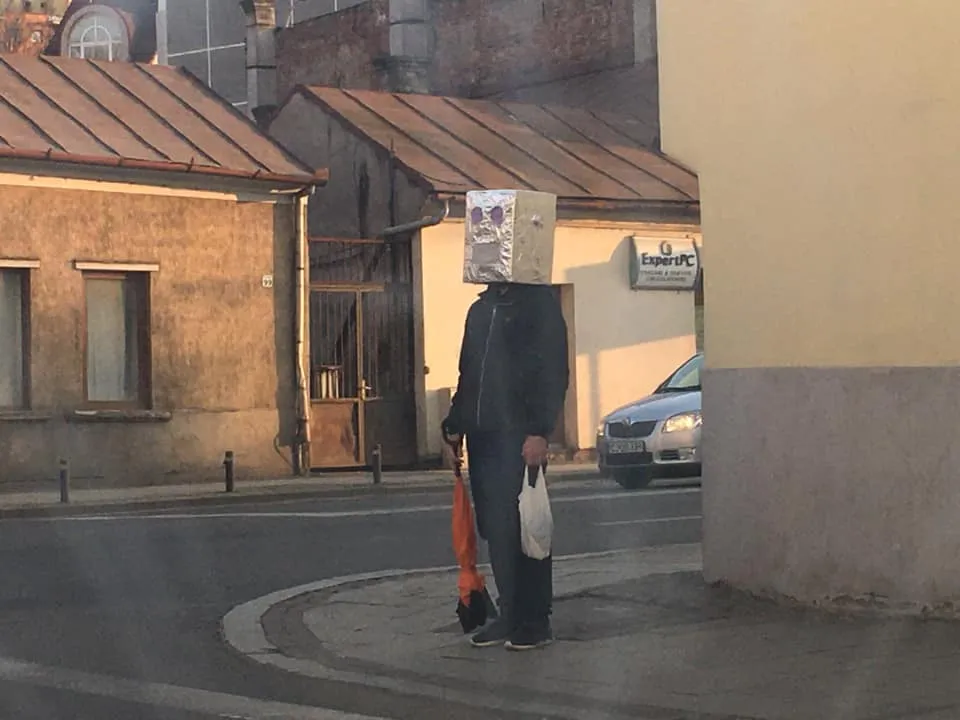 Bărbatul și-a făcut o cască de robot și a ieșit cu ea pe stradă. Cu siguranță în interior a montat tot felul de măsuri de protecție, astfel încât termutul virus COVID -19 să nu-l atingă.