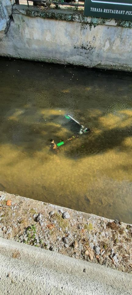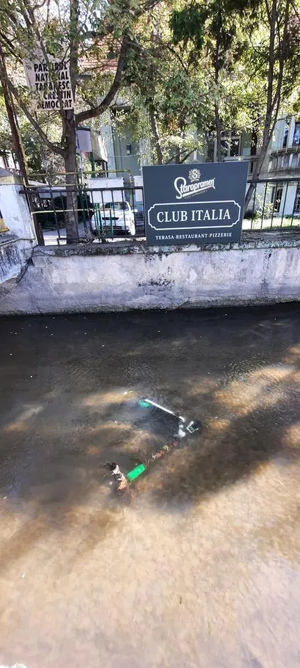 Lângă Parcul Central, o nouă trotinetă electrică a fost aruncată în Canalul Morii, fiind cel mai probabil distrusă de apă. Mai grav este că apa riscă să fie poluată de acidul din bateria trotinetei.