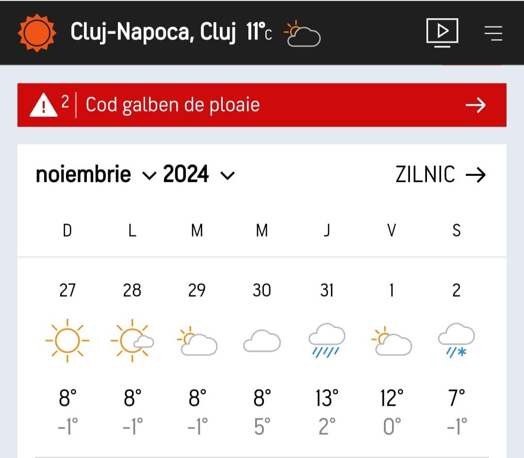 Se pare că în luna noiembrie vom avea parte de primele semne de iarnă. Așadar, potrivit meteorologilor Accuweather, care au actualizat prognoza meteo, primii fulgi de nea vor cădea în Cluj-Napoca luna următoare. Mai exact, pe data de 2 noiembrie, când se anunță scăderea temperaturilor la -1 grade Celsius.