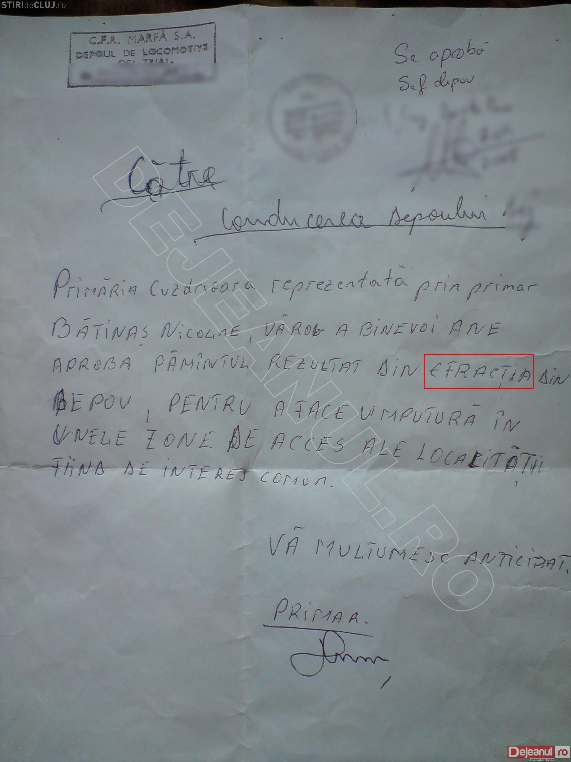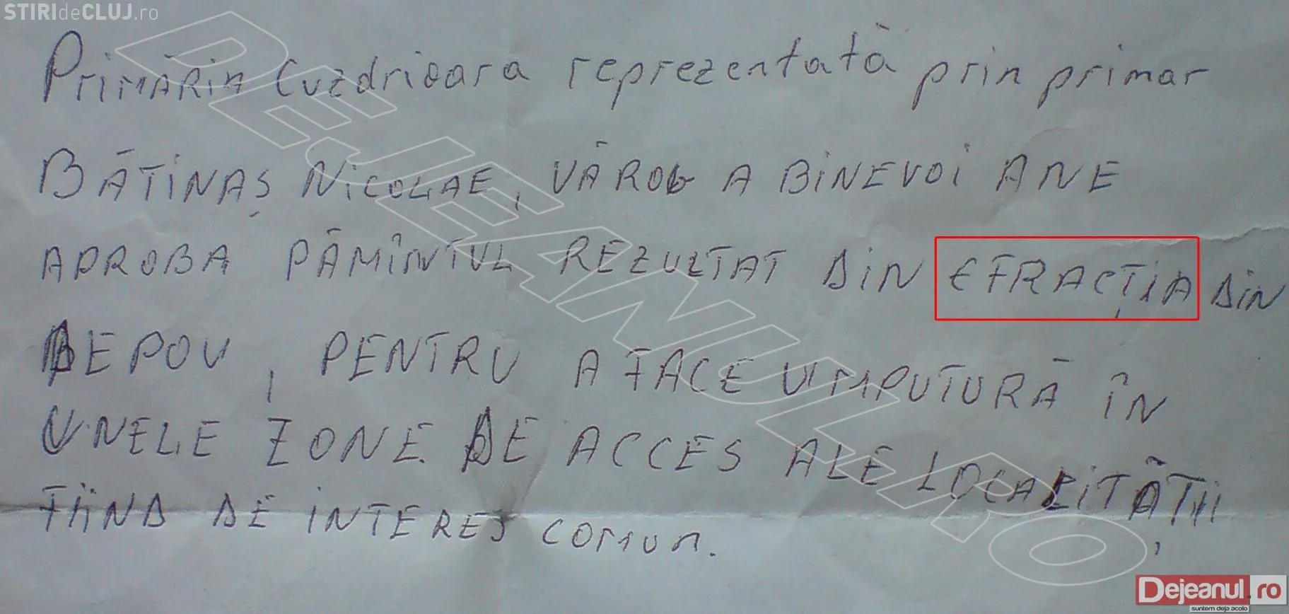 "Cerere trimisa in 2005 de catre Primaria Cuzdrioara catre conducerea Depoului Dej Triaj, a fost scrisa de primarul Batinas chiar in fata mea. Incepe cu scris mare dupa aceea continua cu mic si in loc de cuvantul refractie, care se referea la inlocuirea cailor ferate din Triaj si devierea acestora, primarul a scris EFRACTIE, care are cu totul alt sens. Mai puteti vedea si alte greseli...", scrie dejeanul.ro.
