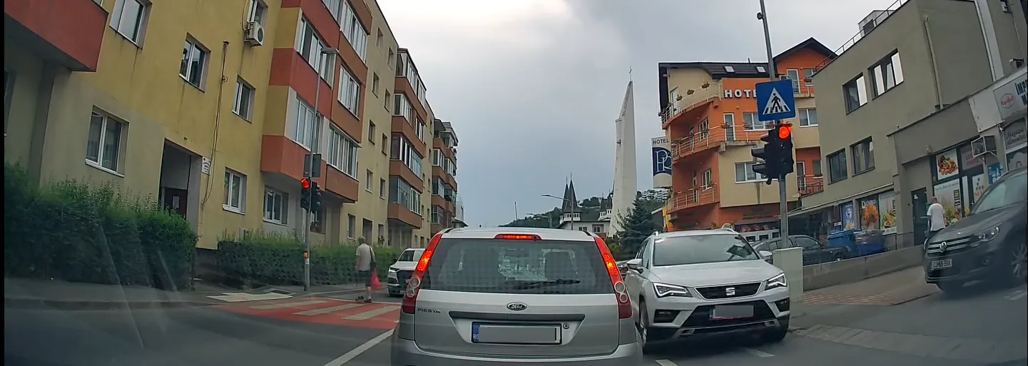 În imaginile surprinse, șoferul cu numere de Cluj, care conducea o mașină tip Seat este observat cum se deplasează pe contrasens. Mai mult decât atât, acesta trece și de o trecere de pietoni, în timp ce semaforul arăta culoarea roșie, oamenii fiind nevoiți să îi acorde prioritate.