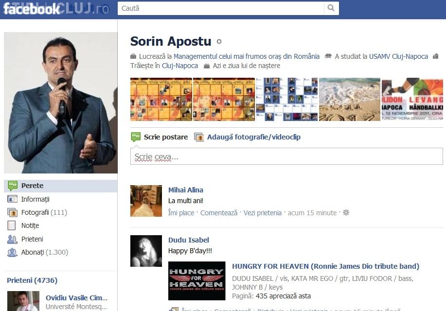 Primarul suspendat., Sorin Apostu, este felicitat de zeci de clujeni pe Facebook la implinirea varstei de 44 de ani.