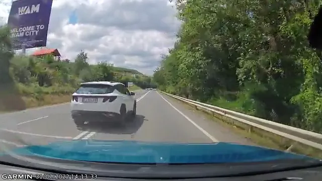 Șoferul unuj SUV a depășit pe linia dublă continuă, în condițiile în care la coborâre este numai o bandă, iar din sens opus venea un șofer. Norocul a fost că cel care a fost depășit a încetinit și i-a permis șoferului grăbit să reintre pe banda de coborâre.