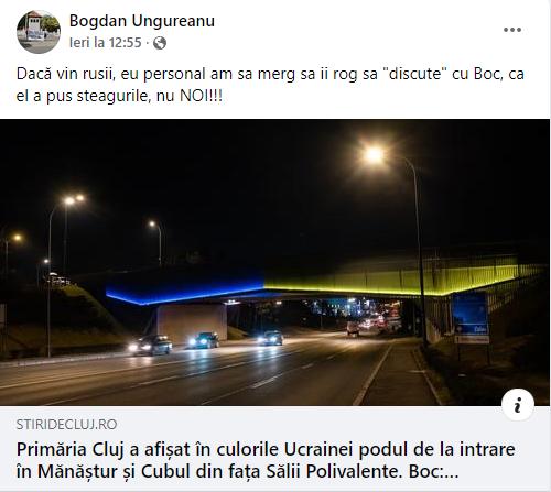 In semn de solidaritate cu vecinii ucraineni, primaria Cluj-Napoca a facut un gest firesc si a pus steagul Ucrainei pe Podul N, din Mănăștur, și pe Sala Polivalentă. Managerul echipei de volei a scris, insa, pe Facebook că: ”Dacă vin rusii, eu personal am sa merg sa ii rog sa "discute" cu Boc, ca el a pus steagurile, nu NOI!!!”.