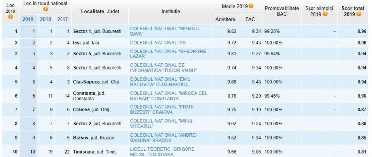 Singurul liceu din Cluj, care reușește să prindă în 2019 top 10 la nivel național, este Colegiul Național Emil Racoviță. Cu un scor de 8.94, Racoviță se clasează pe locul 5, după ce anul trecut a fost pe 4, iar in 2017 pe locul 3.