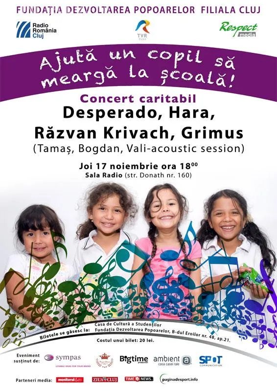 In conditiile in care in Romania, unul din cinci copii renunta la studii din cauza saraciei, in urma concertului realizat la initiativa fundatiei "Dezvoltarea Popoarelor Filiala Cluj", elevii vor primi rechizite, manuale si obiecte vestimentare si vor fi sprijiniti de-a lungul parcursului lor educational.