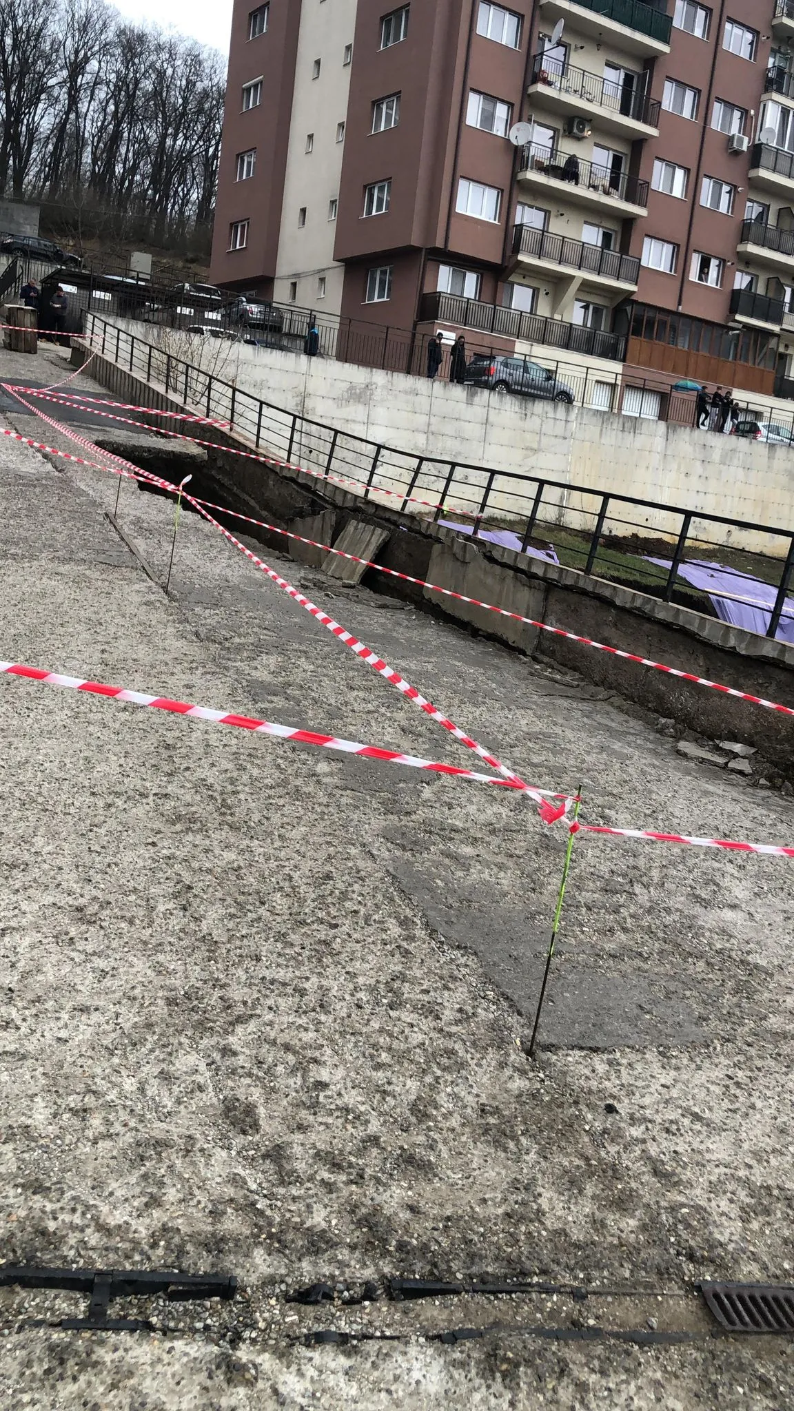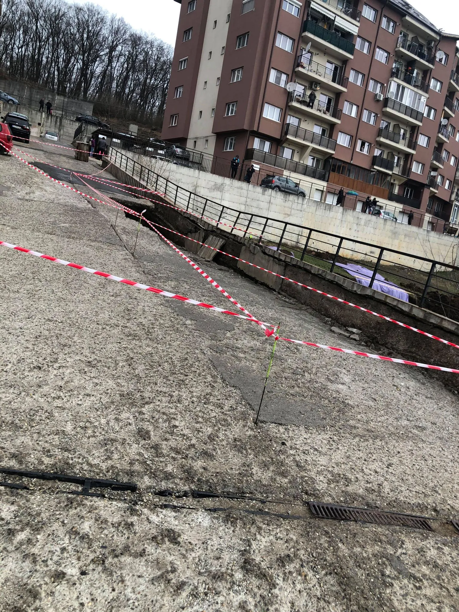 ”E gravă treaba pentru că acela e stâlp de sprijin și langa foarte aproape este bloc de locuințe cu garaj subteran. Drumul care s-a surpat e și cale de acces la celalalte două blocuri aflate mai sus.