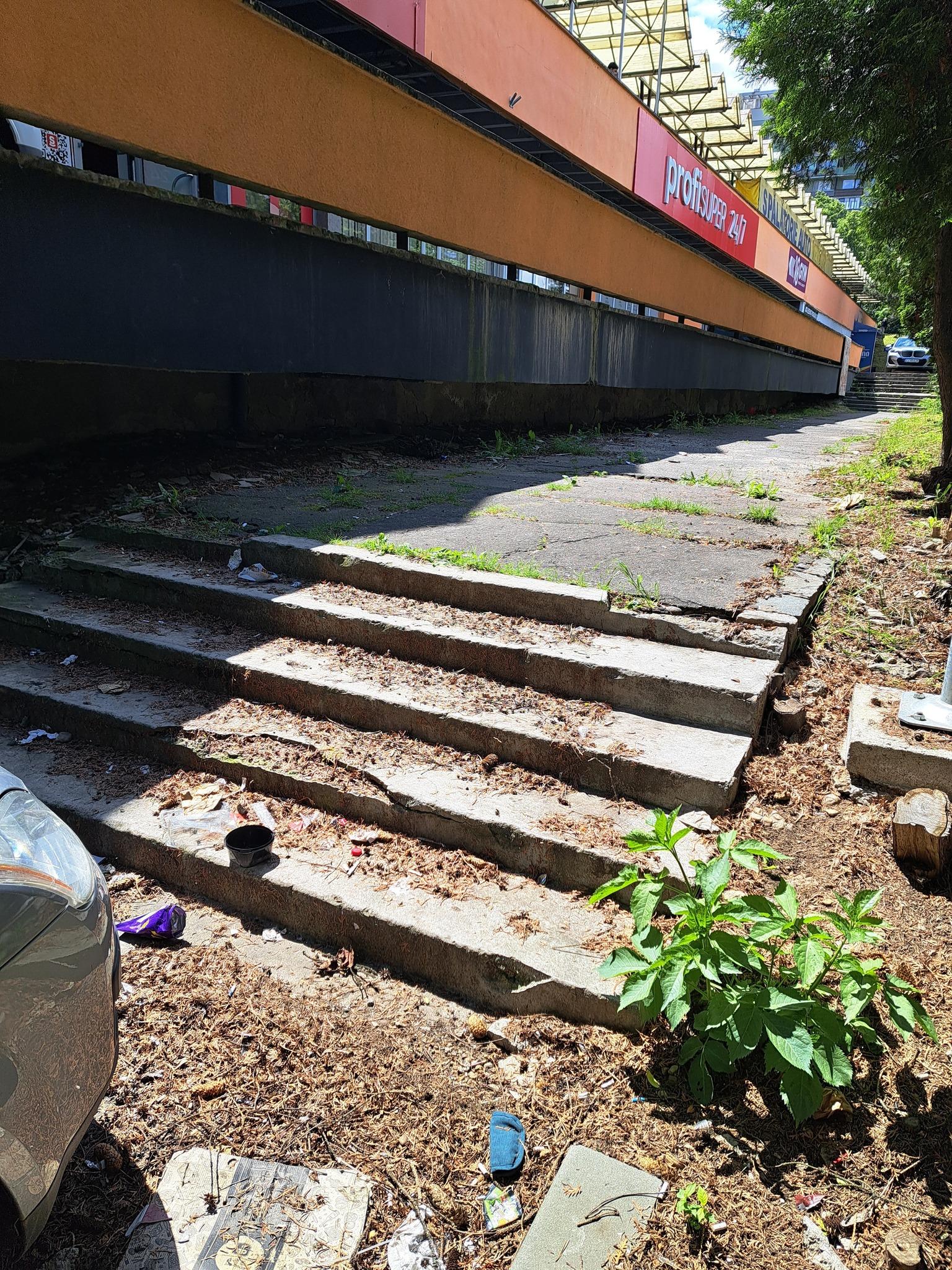 Imaginile surprinse de un locuitor din Cluj-Napoca dezvăluie un peisaj sumbru cu resturi și ambalaje aruncate la întâmplare, buruieni și plăci de beton sparte.