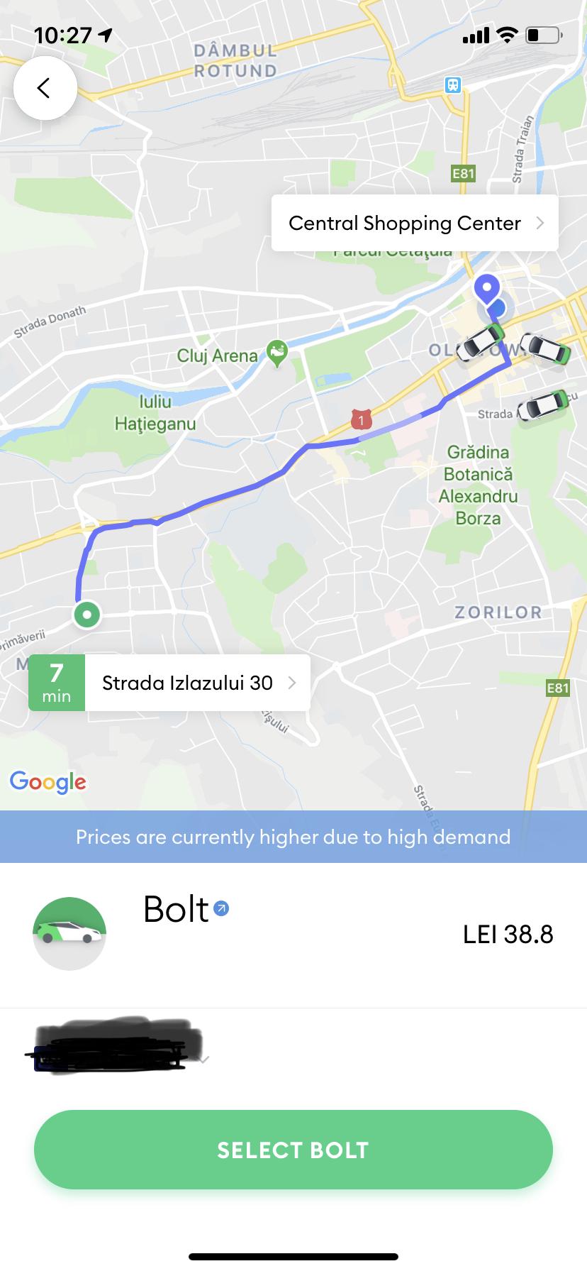 Transportul aleternativ (Bolt, Uber, Clever) nu este nici el rentabil în această dimineață, o cursă din Mănăștur (zona Big) până în Centru costând aproape 40 de lei.