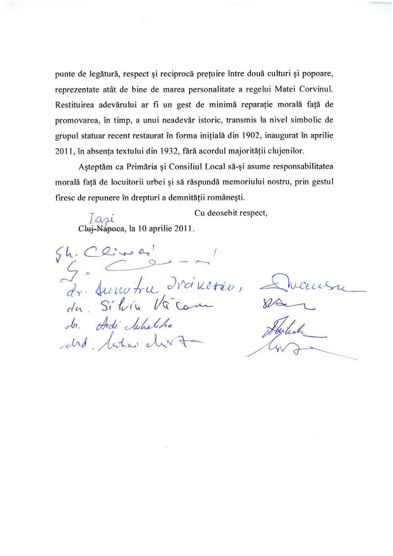 "Am constatat cu surprindere ca la terminarea lucrarilor de restaurare a grupului statuar Matei (Matia) Corvinul nu s-a repus pe soclu textul marelui Nicolae Iorga din 1932. Cu atat mai mult, cu cat acest text a facut parte din chiar istoria monumentului si a mentalului colectiv al Clujului. Precizam ca aplicarea pe soclu a respectivului text explicativ a fost urmarea protestului intelectualitatii romane clujene interbelice fata de mesajul din 1902, cu steagul Moldovei inclinat la picioarele regelui Matei Corvinul", au scris intelectualii din Cluj si Iasi in scrisoarea adresata municipalitatii clujene.