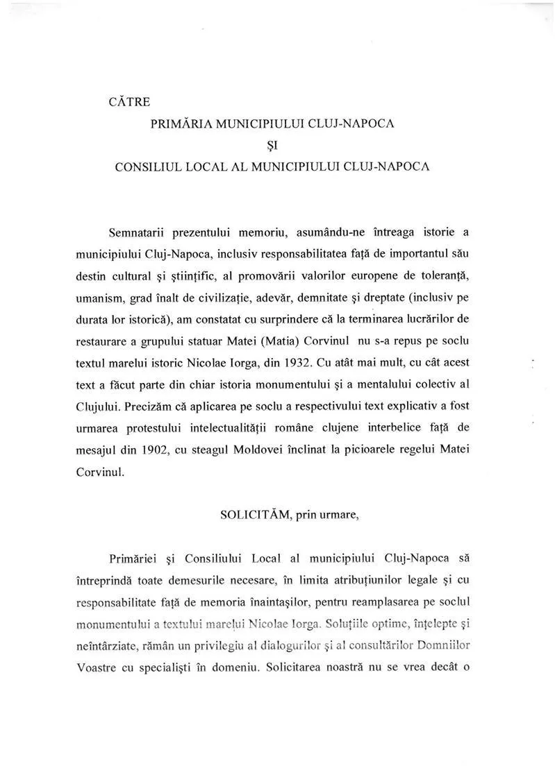 "Solicitam Primariei si Consiliului Local al municipiului Cluj Napoca sa intreprinda toate demersurile necesare, in limita atributiunilor legale si cu responsabilitate fata de memoria inaintasilor, pentru reamplasarea pe soclul monumentului a textului marelui Nicolae Iorga. Solutiile optime, intelepte si neintarziate, raman un privilegiu al dialogurilor si al consultarilor Domniilor Voastre cu specialistii in domeniu. Solicitatea noastra nu se vrea decat o punte de legatura, respect si reciproca pretuire intre doua culturi si popoare, reprezentate atat de bine de marea personalitate a regelui Matei Corvinul. Restituirea adevarului ar fi un gest de minima reparatie morala fata de promovarea, in timp, a unui neadevar istoric, transmis la nivel simbolic de grupul statuar recent restaurat in forma initiala din 1902, inaugurat in aprilie 2011, in absenta textului dn 1932, fara acordul majoritatii clujenilor", se mai arata in documentul citat.