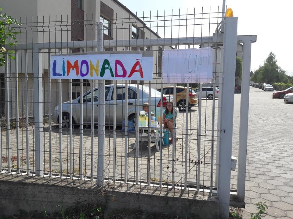 Tatăl copiilor a montat duminică reclama pentru noul stand de limonadă, pentru ca totul să fie vizibil din stradă. Pentru a cumpăra trecătorii trebuie să intre puțin în curtea blocului.