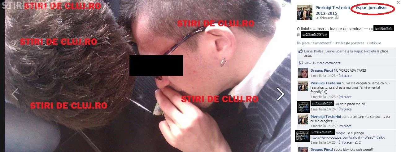 O fotografie în care apar doi studenți de la Facultatea de Jurnalistică din Cluj-Napoca, în timp ce trag pe nas niște ”prafuri”, a fost postată pe un grup de Facebook al studenților de la Jurnalistică.