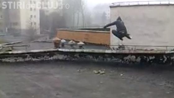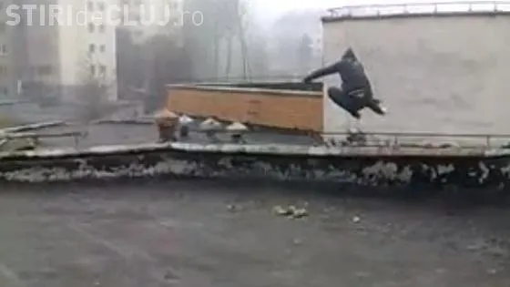 Doi tineri nu au găsit un loc mai bun pentru a-și etala tehnica de Parkour decât pe acoperișul cinematograful Dacia, din Mănăştur, abandonat de câțiva ani.