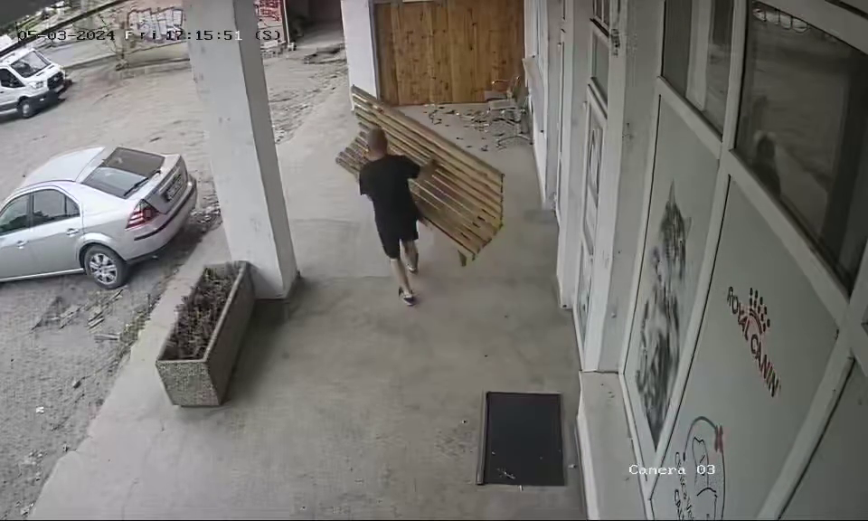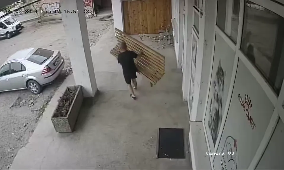 ”Domnu, adu banca înapoi!” - Un clujean a furat în Sâmbăta Mare o bancă de lemn din fața unui cabinet veterinar - VIDEO
