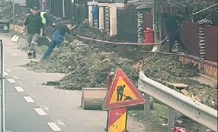 O scenă desprinsă din filmele de comedie a fost surprinsă de un șofer aflat în trafic. Doi muncitori au fost filmați în timp ce săpau un șanț, folosind o tehnică ”revoluționară”.
