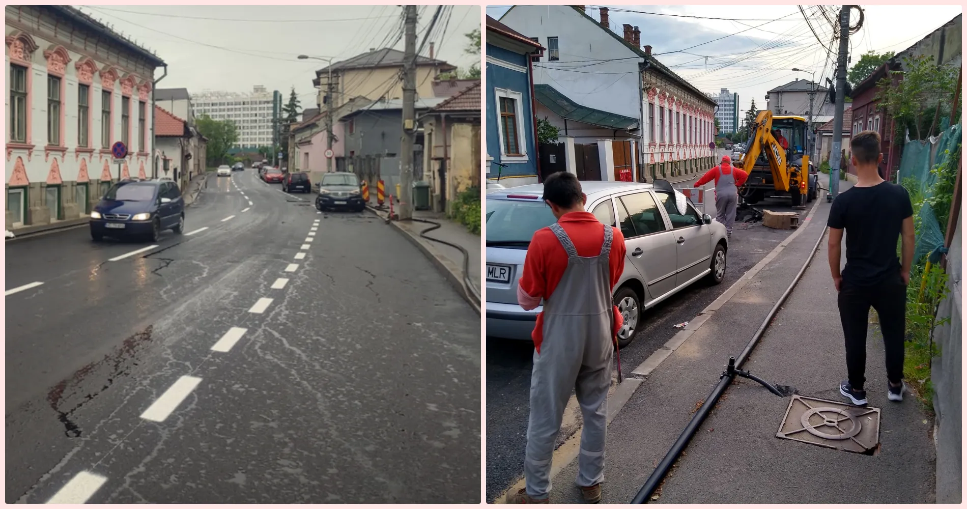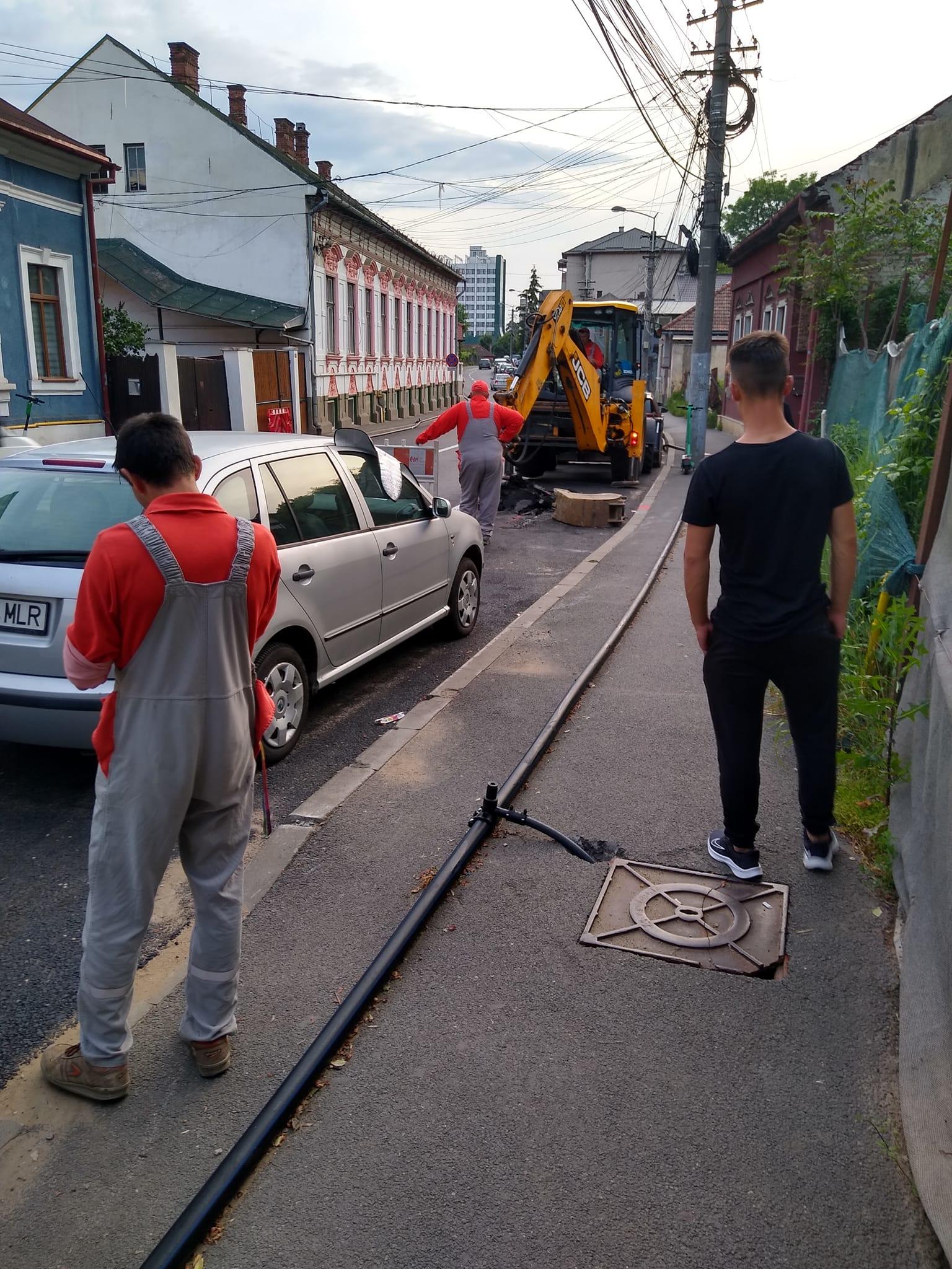 ”Ăștia-s de la gaz! Urmează cei de la apă, conducta pe care o vedem pe trotuar și care intră(iese?) în capacul de canal crăpat, nu cred că rămâne acolo!”