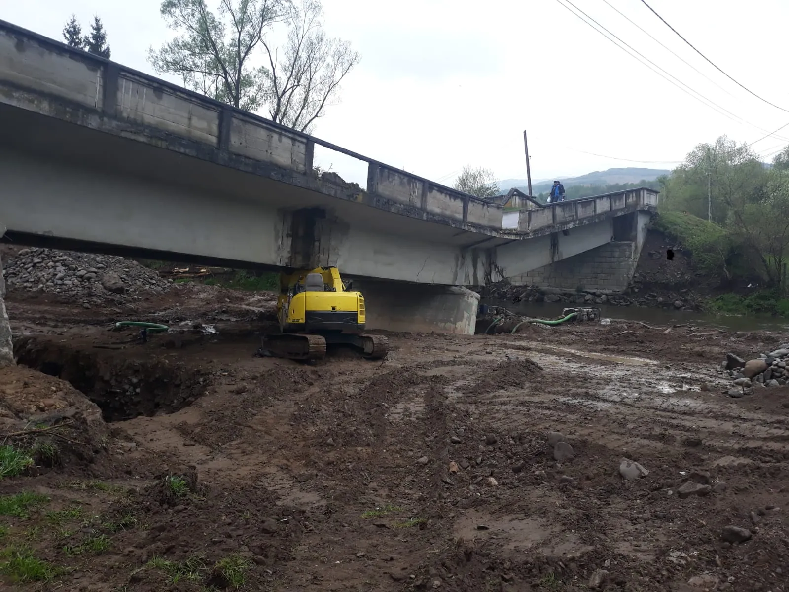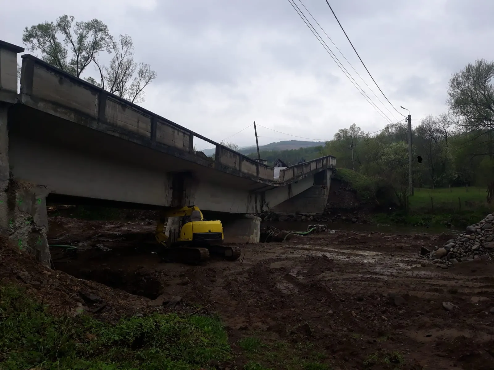 Un utilaj care a săpat la pilonul podului a rămas prins sub traversele de câteva tone.