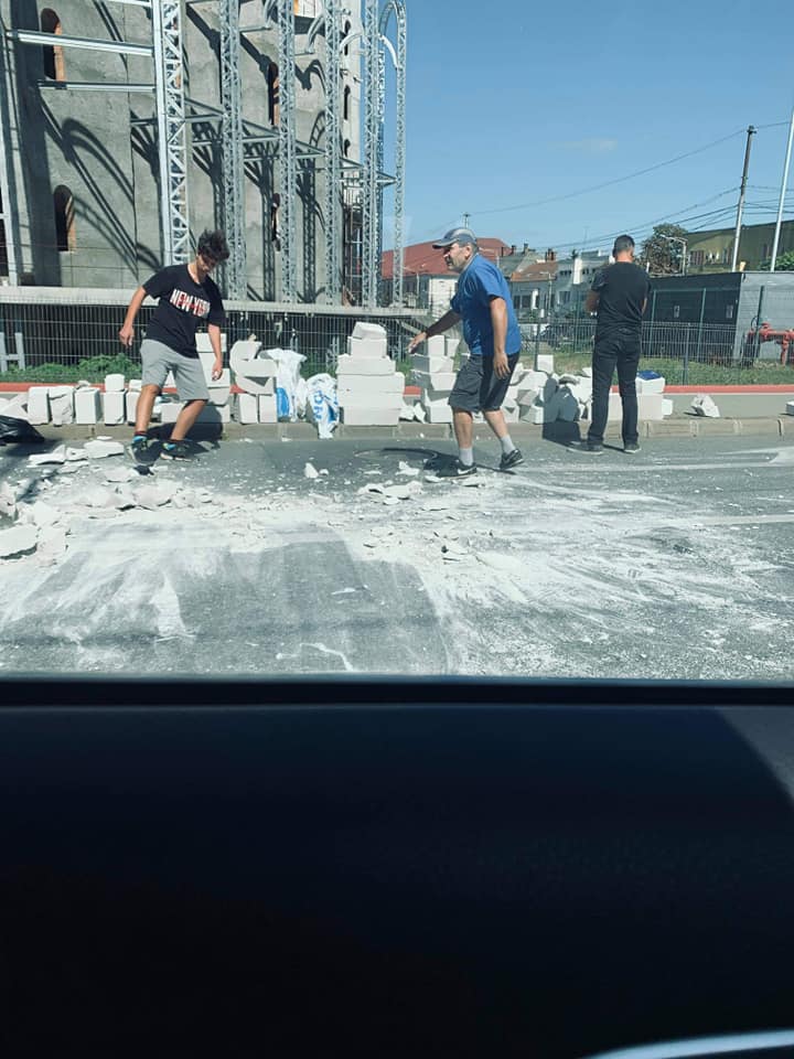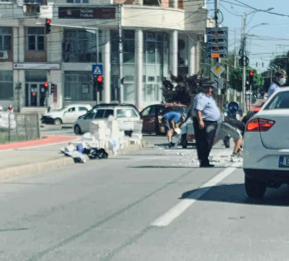 Blocurile de BCA s-au împrăștiat pe asfalt, iar un polițist a fost trimis să dirijeze circulația.