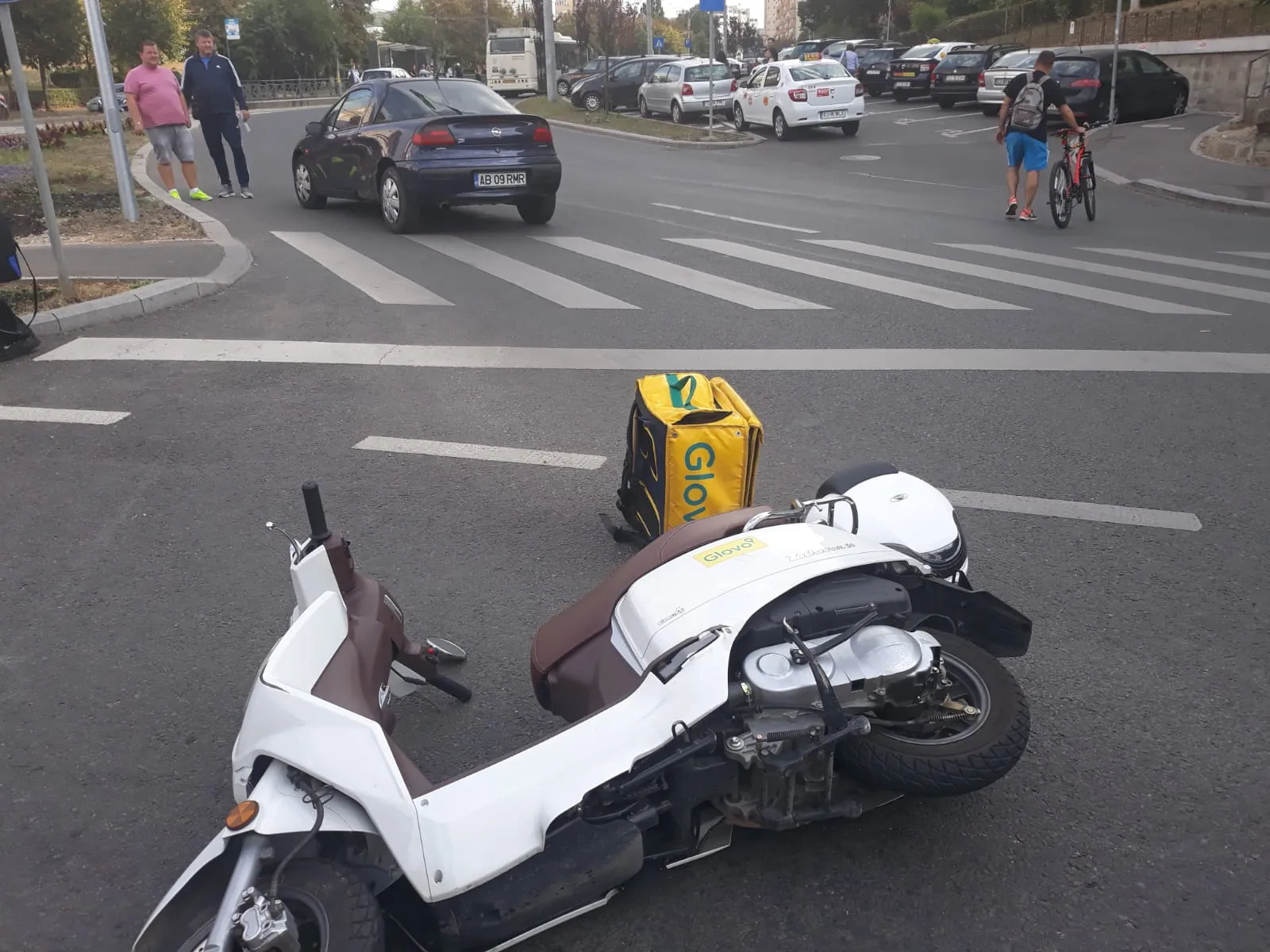 Un motoscuter care făcea livrări de mâncare s-a împrăștiat pe stradă, după ce a fost lovit de un alt autoturism.