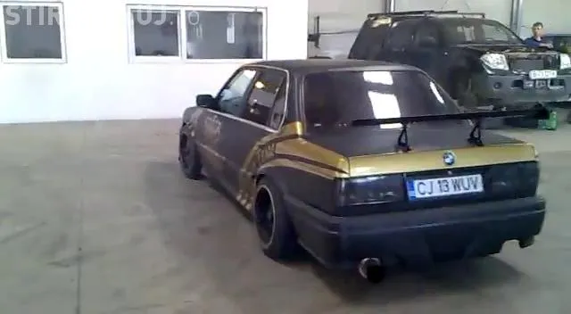 Soferul unui BMW tunat a facut drifturi printr-un service auto din Cluj-Napoca. Scena a fost filmata, inclusiv in momentul in care masina se invartea in jurul unui alt tanar, intr-o demonstratie de indemanare.