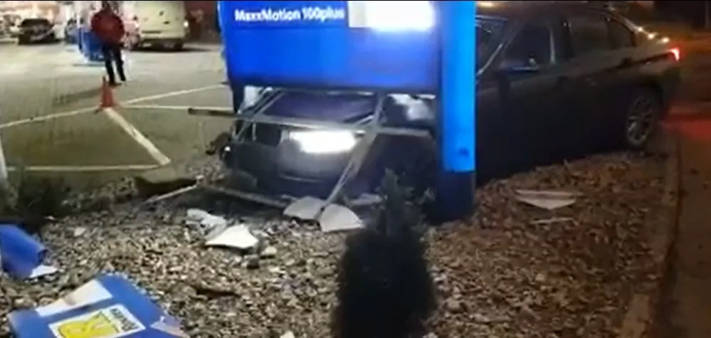 ”Drifturi” în Piața Mărăști! Un BMW a lovit reclama OMV, iar șoferul a fugit - VIDEO