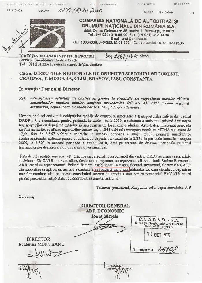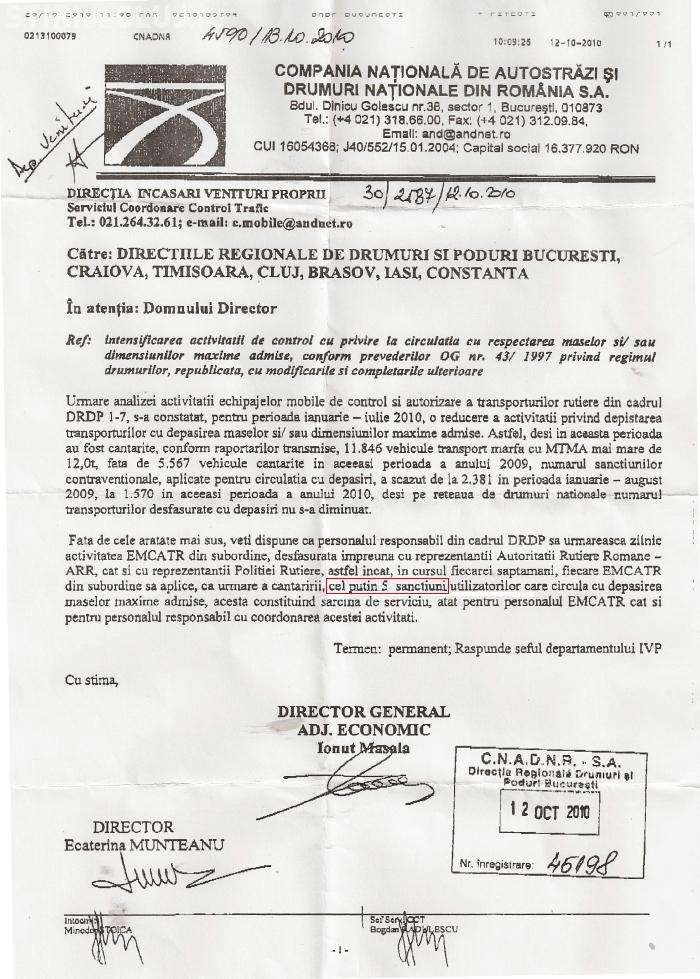 Printr-o dispozitie semnata de directorul general adunct economic al Companiei Nationale de Autostrazi si Drumuri Nationale din Romania, Ionut Masala, Directiile Regionale de Drumuri si Poduri din tara sunt informate ca trebuie "sa urmareasca zilnic activitatea EMCATR (n.red. Echipajele de control a traficului rutier) din subordine, desfasurata impreuna cu reprezentantii Autoritatii Rutiere Romane, cat si cu reprezentantii Politiei Rutiere, astfel incat, in cursul fiecarei saptamani, fiecare EMCATR din subordine sa aplice, ca urmare a cantaririi, cel putin 5 sanctiuni, utilizatorilor care circula cu depasirea maselor maxime admise, aceasta constituind sarcina de serviciu, atat pentru personalul EMCATR, cat si pentru personalul responsabil cu coordonarea acestei activitati", se arata in documentul oficial.
