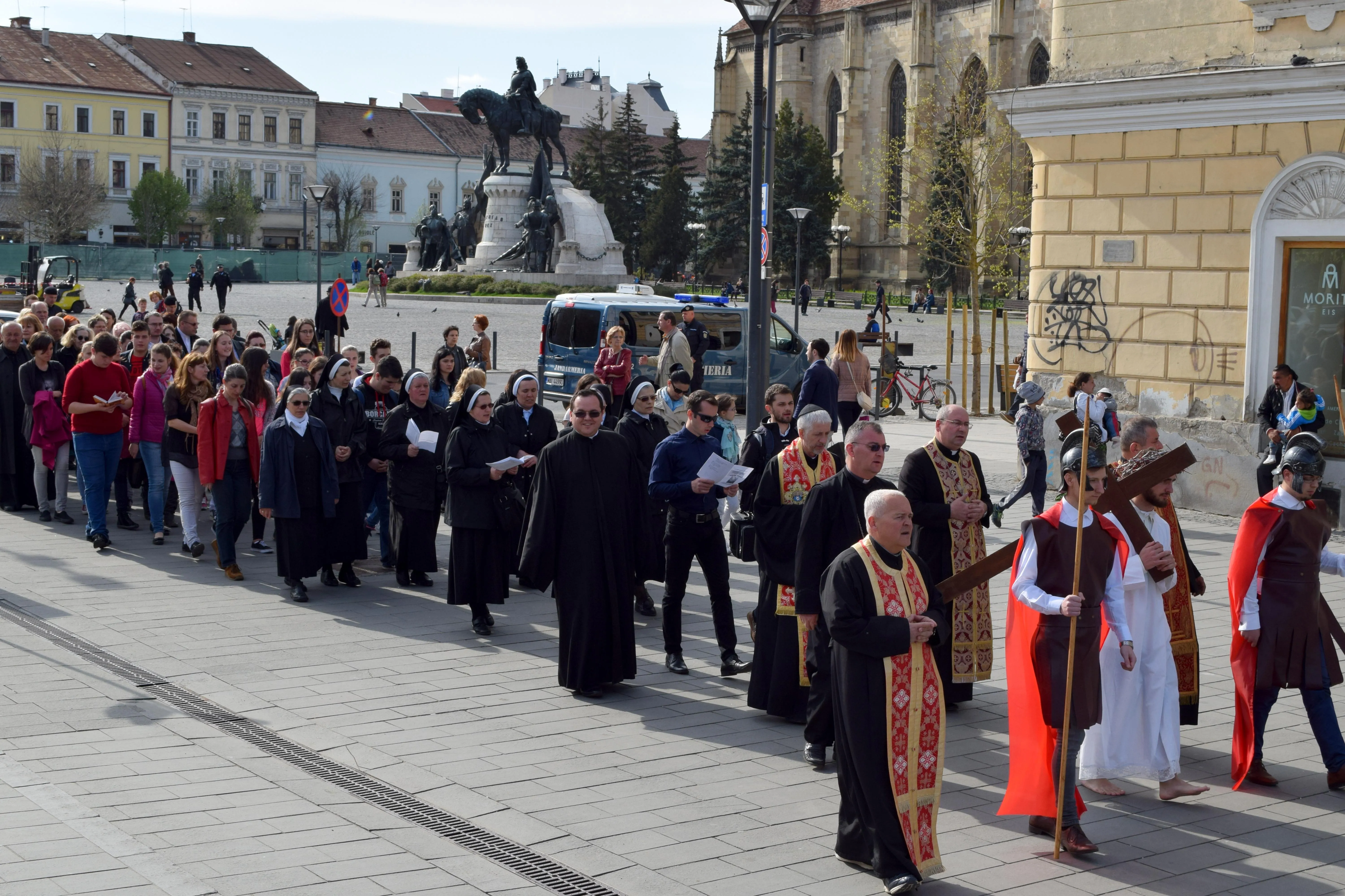 La pornirea din Piaţa Unirii, PS Florentin, Ierarhul de Cluj-Gherla, a explicat: ”Procesiunea tradițională Calea Crucii este una dintre cele mai vechi tradiții ale Bisericii, inițiată în Țara Sfântă, prin care creștinii încercau să trăiască la persoana întâi momentul Patimilor Domnului, refăcând exact traseul pe care Hristos l-a parcurs, respectiv, din momentul judecății de la locul ”pardosit cu pietre” unde a fost condamnat la moarte și apoi, rând pe rând, prima cădere sub povara Crucii, apoi întâlnirea cu mama sa Preasfânta Fecioară Maria, urmată de momentul în care Simon din Cirene, fără voia lui este pus sub Cruce și primește harul Crucii, apoi a doua cădere, apoi întâlnirea cu Veronica – când îşi lasă chipul întipărit pe maramă ca prima icoană a Mântuitorului, apoi a treia cădere, dezbrăcarea de haine și țintuirea lui Hristos pe Cruce, moartea Sa pe Cruce cu acel strigăt, ”împlinitu-s-a!” – împlinitu-s-a planul lui Dumnezeu, dar și Paştile ebraice care se preschimbă în Trupul și Sângele mântuitor – și coborârea de pe Cruce respectiv așezarea lui Hristos în mormânt.