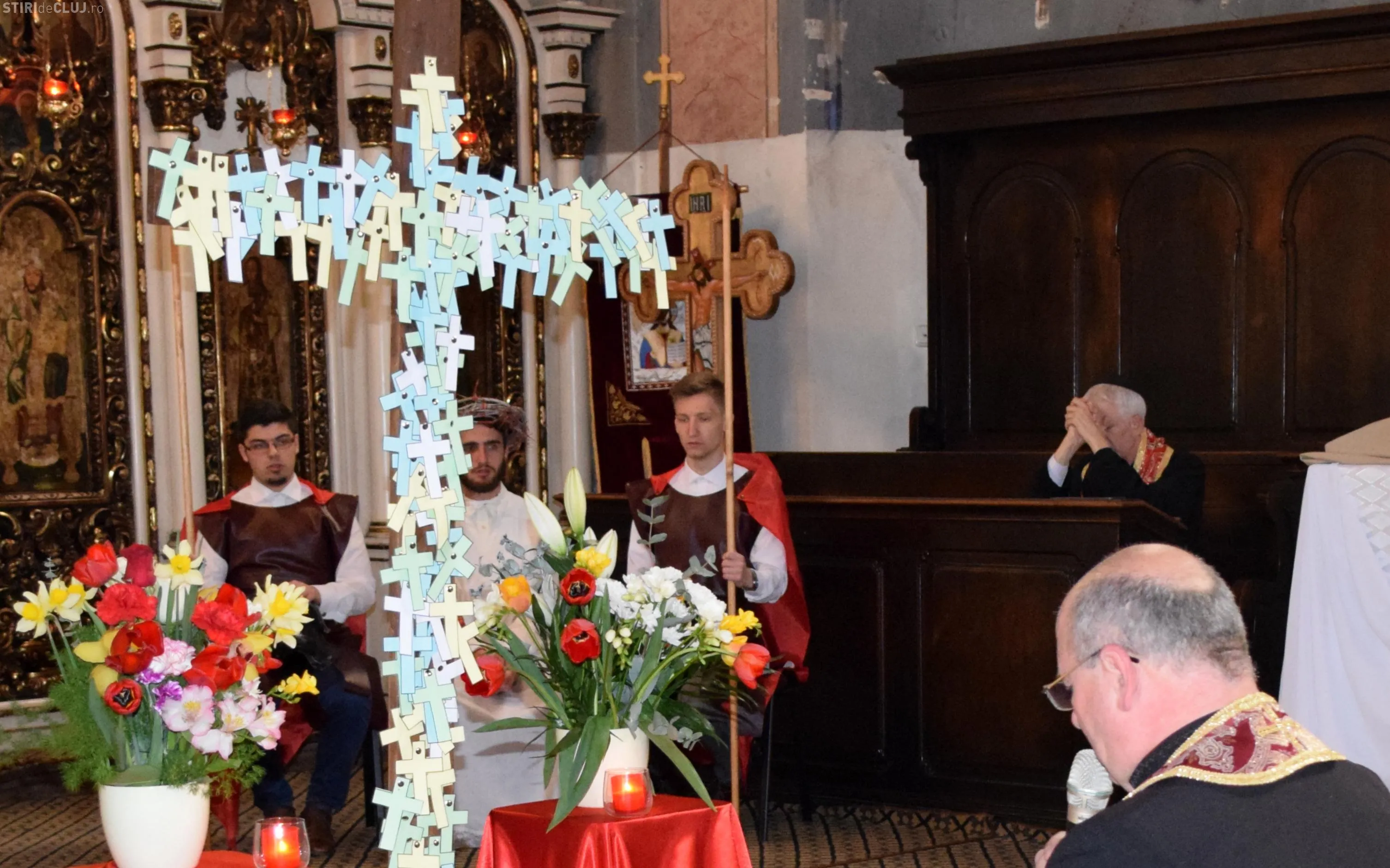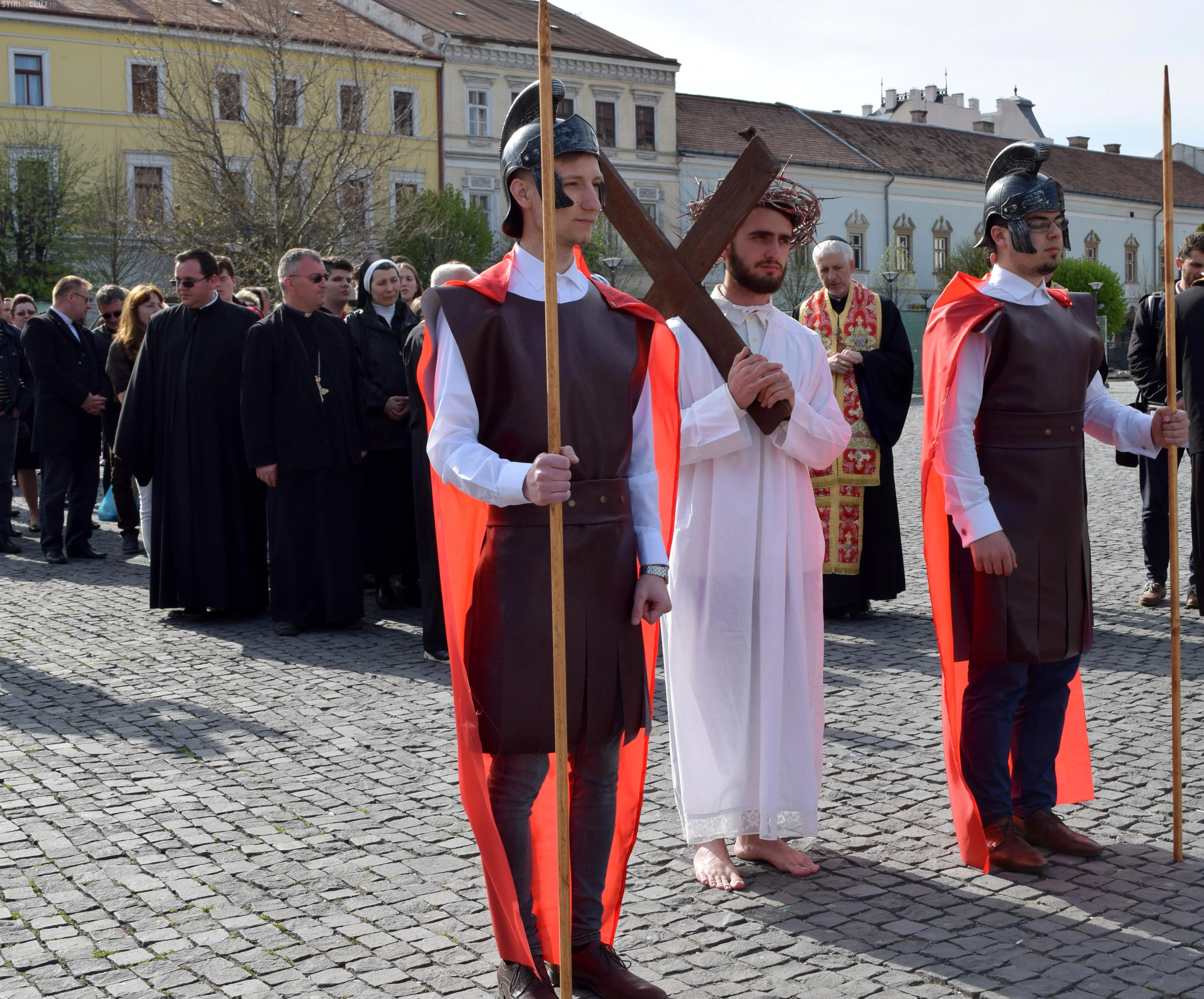 Tineri în costume speciale, – în acest an studenţi ai Seminarului Teologic eparhial – au interpretat rolul lui Isus şi al soldaţilor romani pe drumul Calvarului.