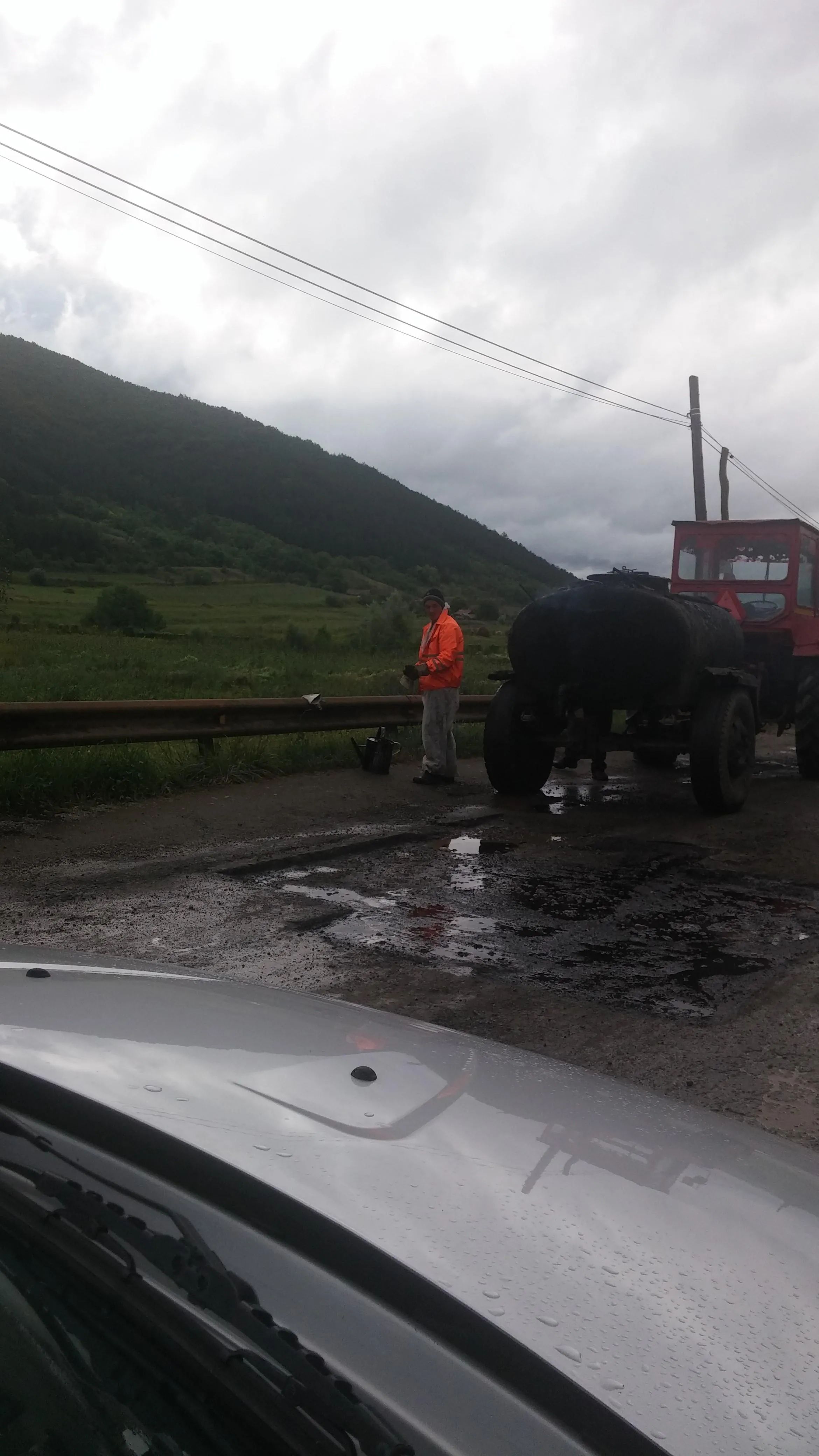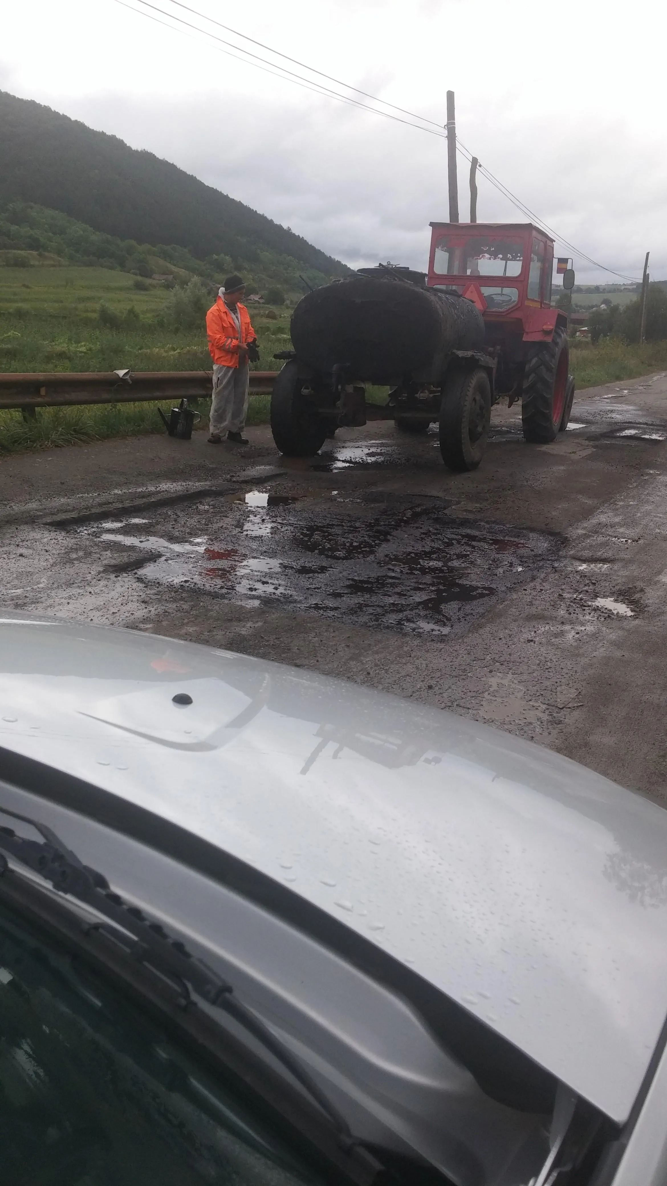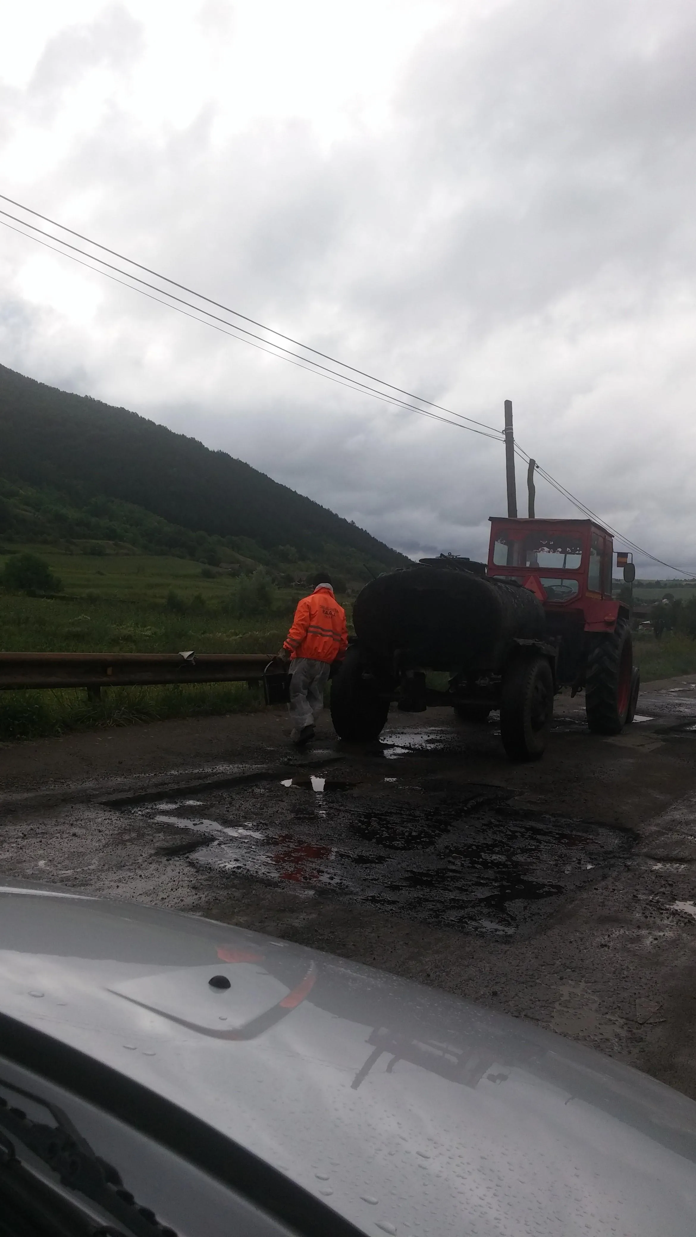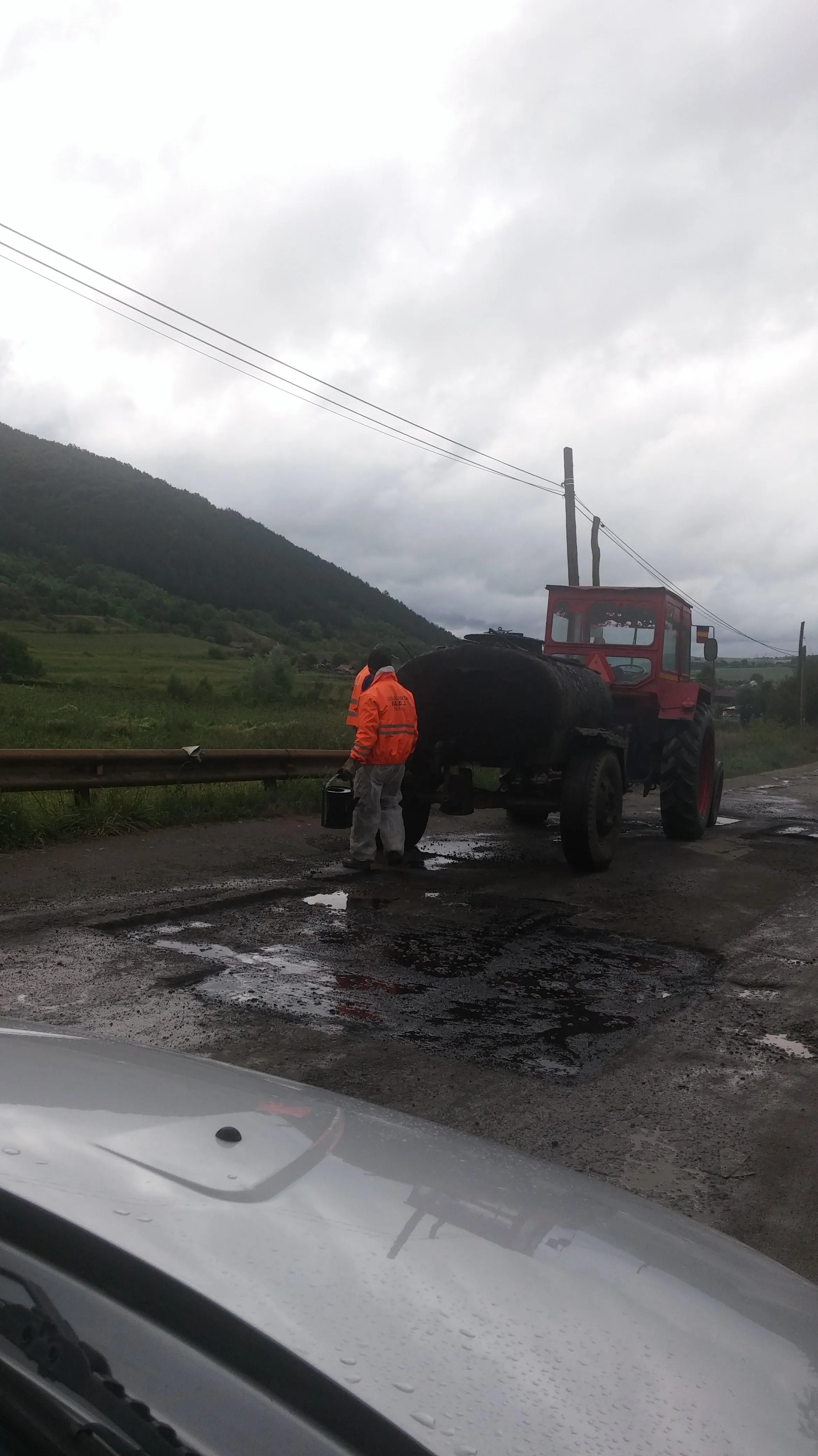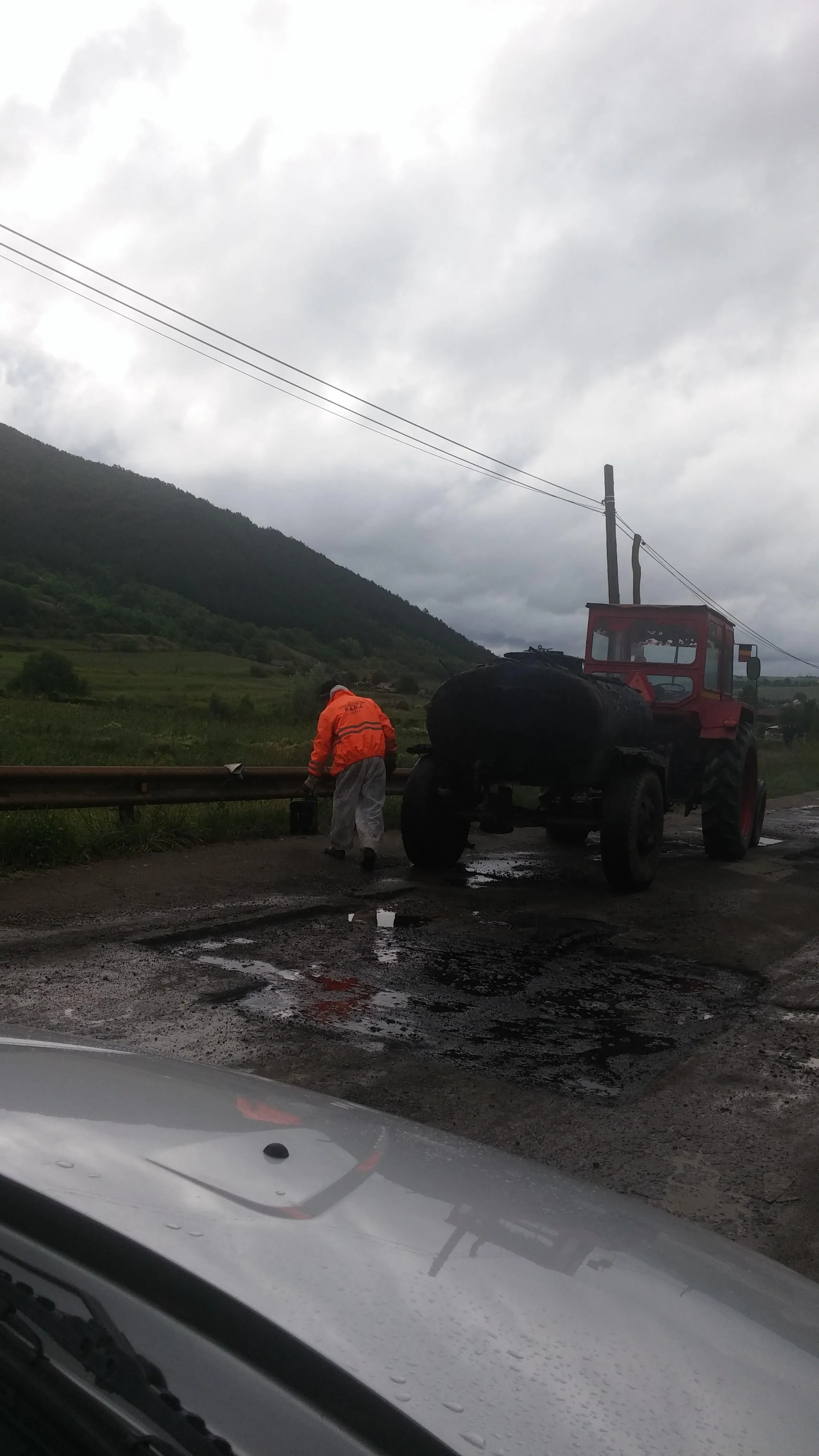 ”Ieri (vineri) am surprins pe drumul dintre Fizeșu Gherlii și Sântioana, o lucrare de asfaltare făcută în bătaie de joc de către RADJ Cluj. Lucrătorii din imaginile pe care vi le atașez asfaltau turnând amorsa și asfaltul în gropi pline cu apă. În momentul în care am început să fotografiez cei doi muncitori s-au ascuns după tractor, semn clar ca știau ca fac o lucrare de mântuială. Cred ca asemenea lucrări ar trebui oprite și responsabilii ar trebui trași la răspundere”, apreciază Mihai B.