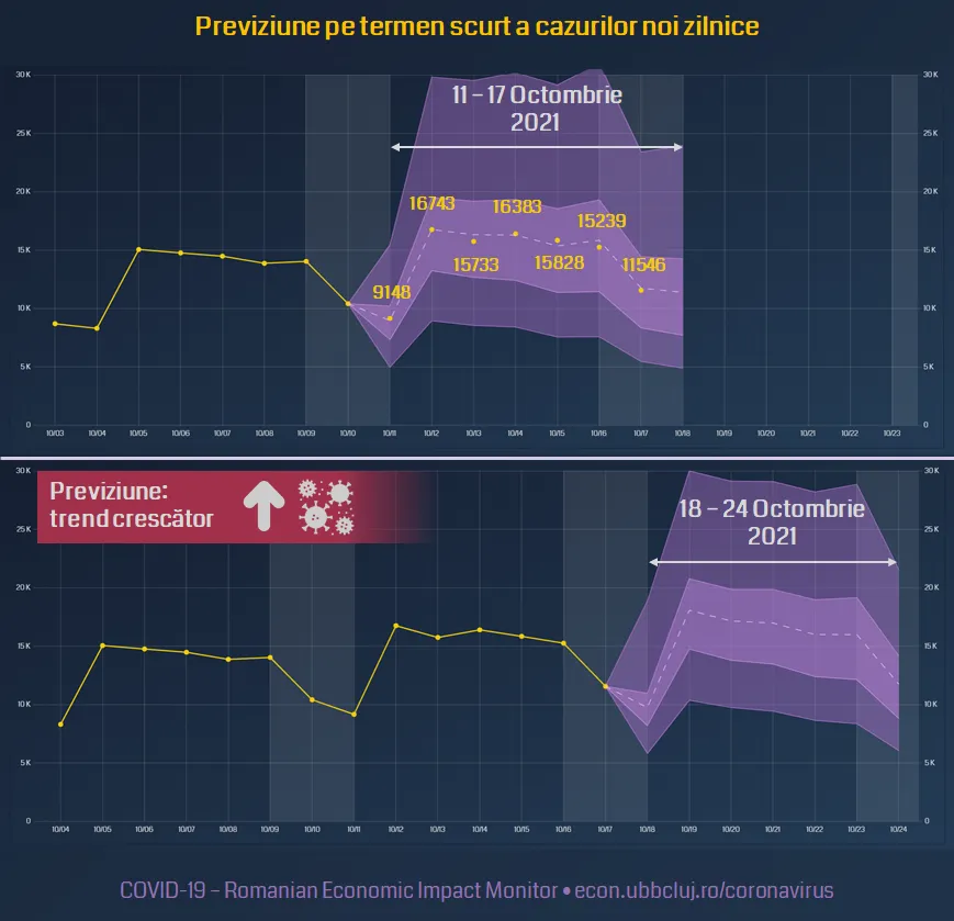 În perioada 18 - 24 octombrie se va ajunge la un platou, după care ar putea fi posibilă o scădere a cazurilor. Cercetătorii nu au spus ce se va întâmpla după, pentru că totul ține de numărul de vaccinați, de modul în care se respectă restricțiile etc.