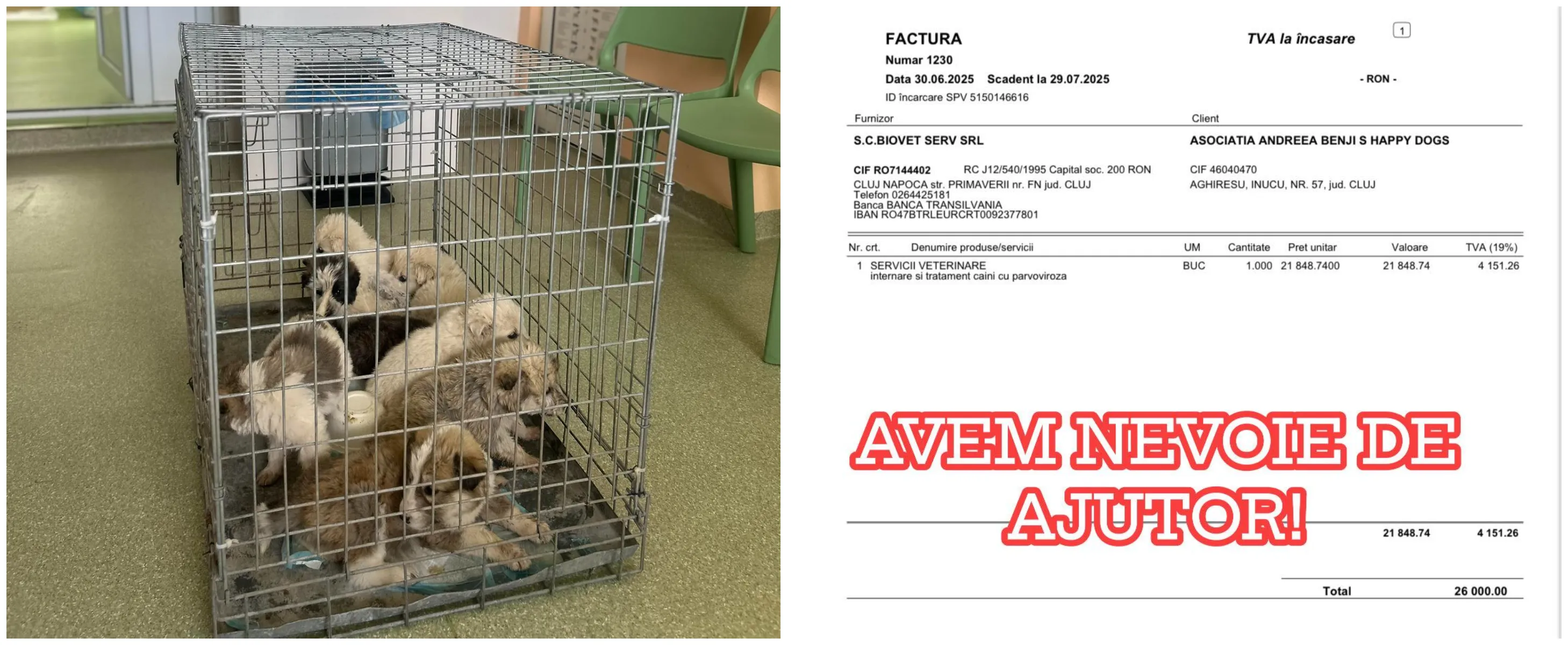 Totul a pornit de la o luptă pe viață și pe moarte: 9 pui diagnosticați cu parvoviroză, una dintre cele mai letale boli care pot lovi câinii. Au urmat 14 zile de internare, cu tratamente costisitoare și emoții la fiecare oră. Doar 6 au supraviețuit. Dar în urma eforturilor a rămas o factură uriașă de 26.000 de lei.