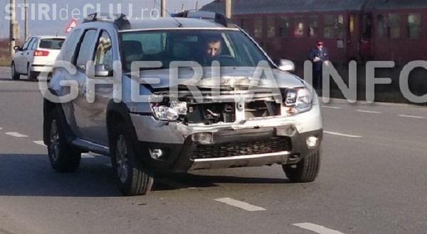 Dacia Duster în care se afla primarul din Gherla a fost acroșată de tren, marți, în jurul orei 14.30, în localitatea Livada.