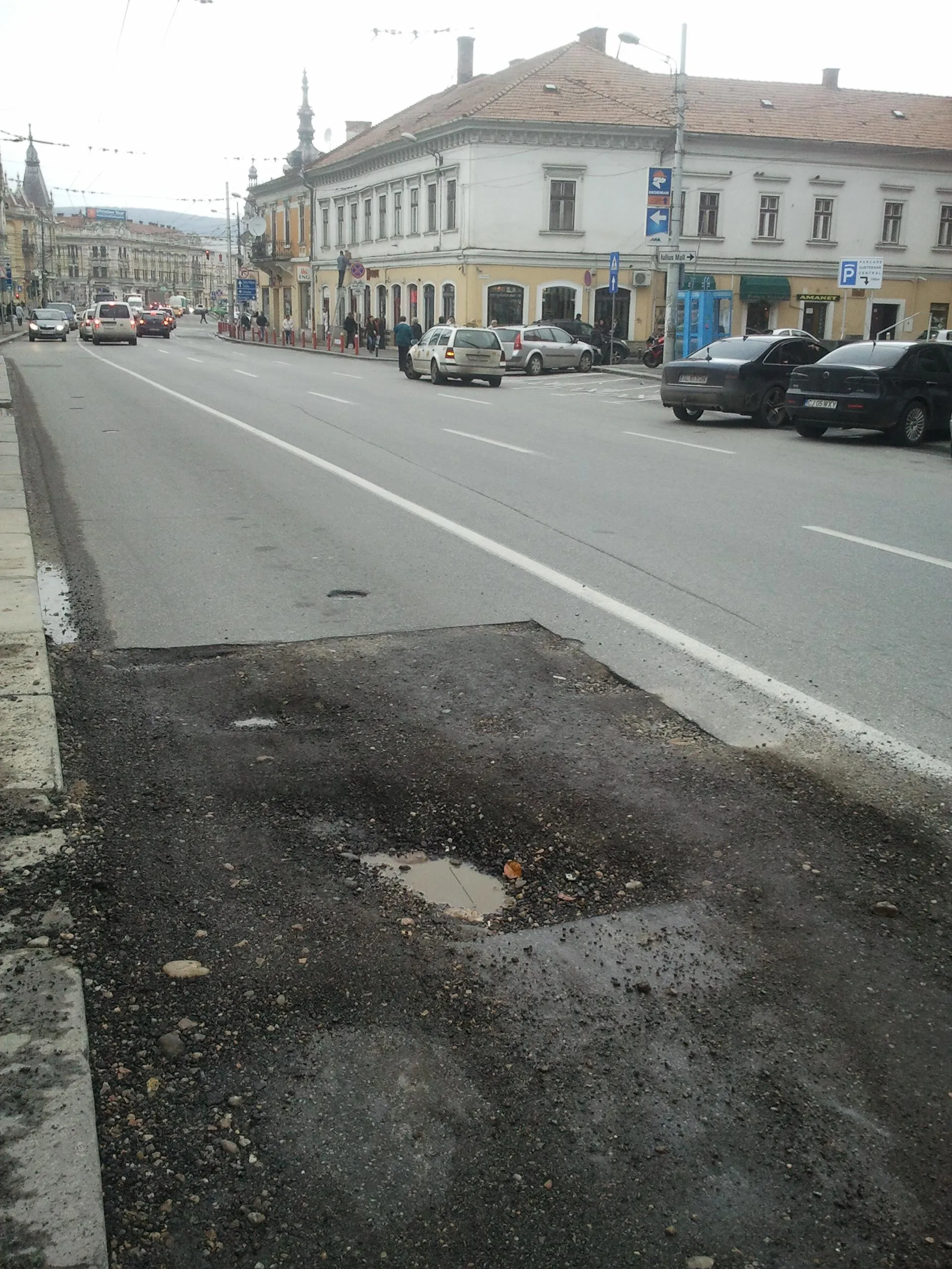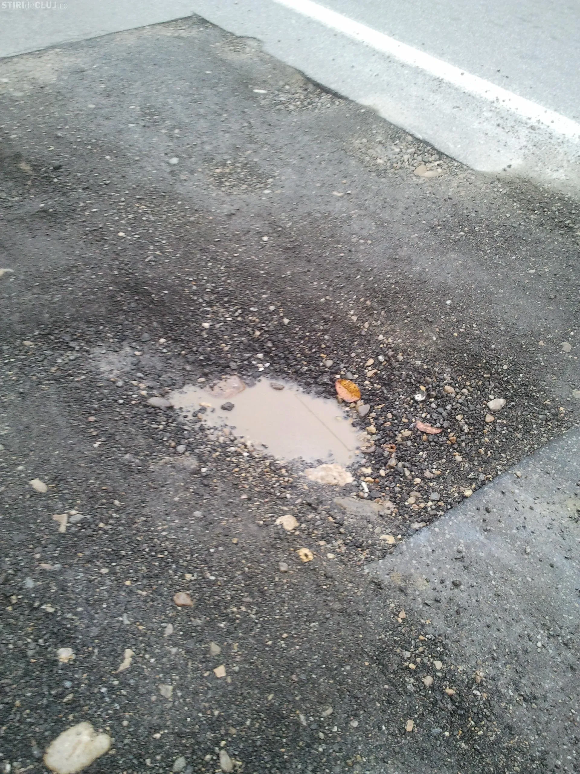 Ploaia și traficul a ”măturat” pietrișul, astfel că groapa devine tot mai adâncă, într-o zonă extrem de circulată a Clujului.