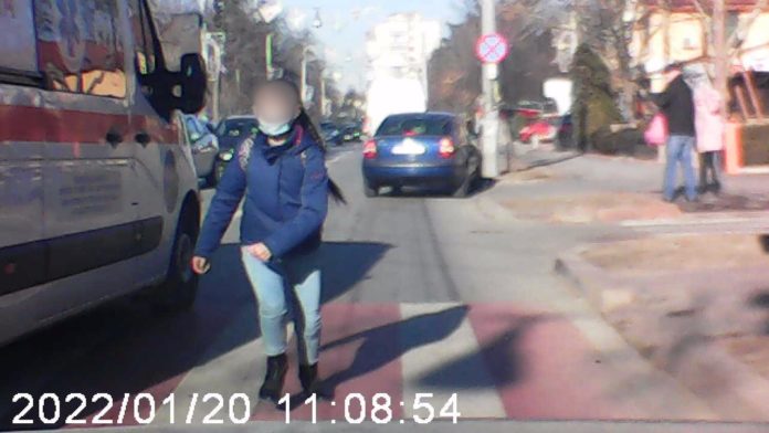 Situația a fost surprinsă de un şofer care oprise pentru a face loc autosanitarei. În imagine se observă cum copila nu s-a asigurat deloc la trecere şi a vrut să treacă în fugă. Imediat ce autosanitara opreşte, copila realizând probabil ce a făcut, se întoarce pe trotuar.