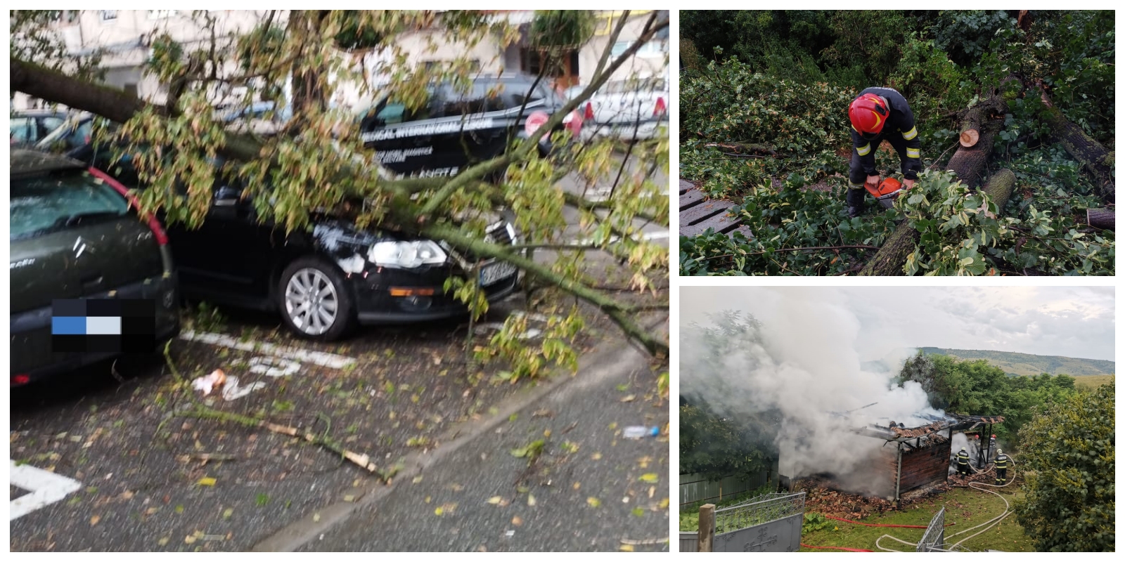 Cluj-Napoca: 6 arbori degajați și pagube înregistrate la două autoturisme. De asemenea, acoperișul a fost parțial afectat la o clădire pe strada Anina, precum și la o clădire de pe strada Arinilor. Au intervenit Detașamentele 1 și 2 Cluj-Napoca.