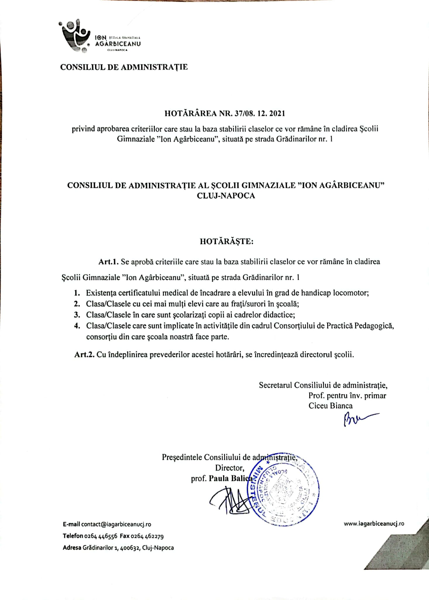 Potrivit criteriilor stabilite de Consiliul de Administrație, rămân la școală și nu se mută copiii care au certificat de handicap, cei care au frați la Școala Ion Agârbiceanu, copiii cadrelor didactice și cei care sunt implicați în activități din cadrul Consorțiului de Practică Pedagogică.