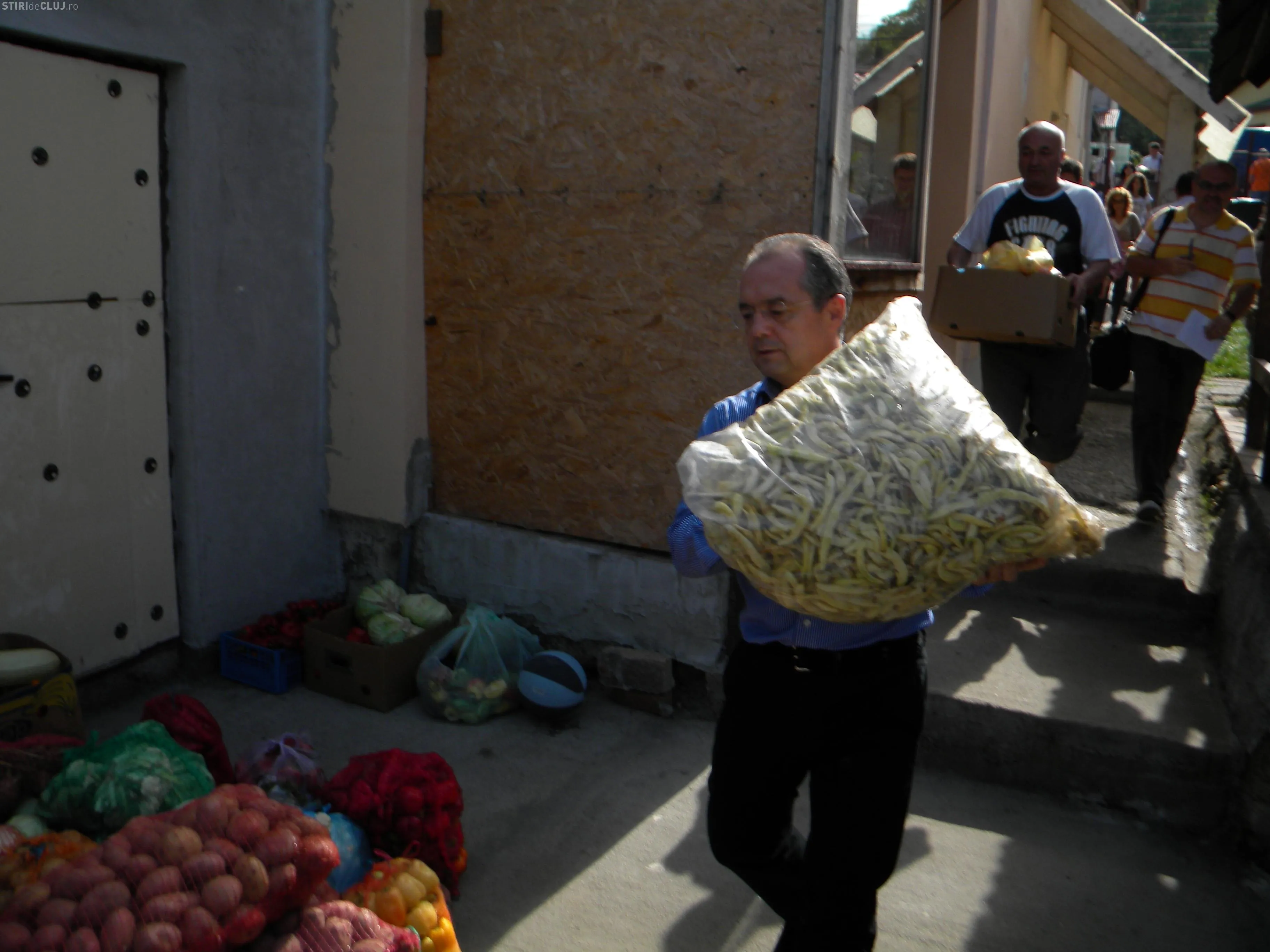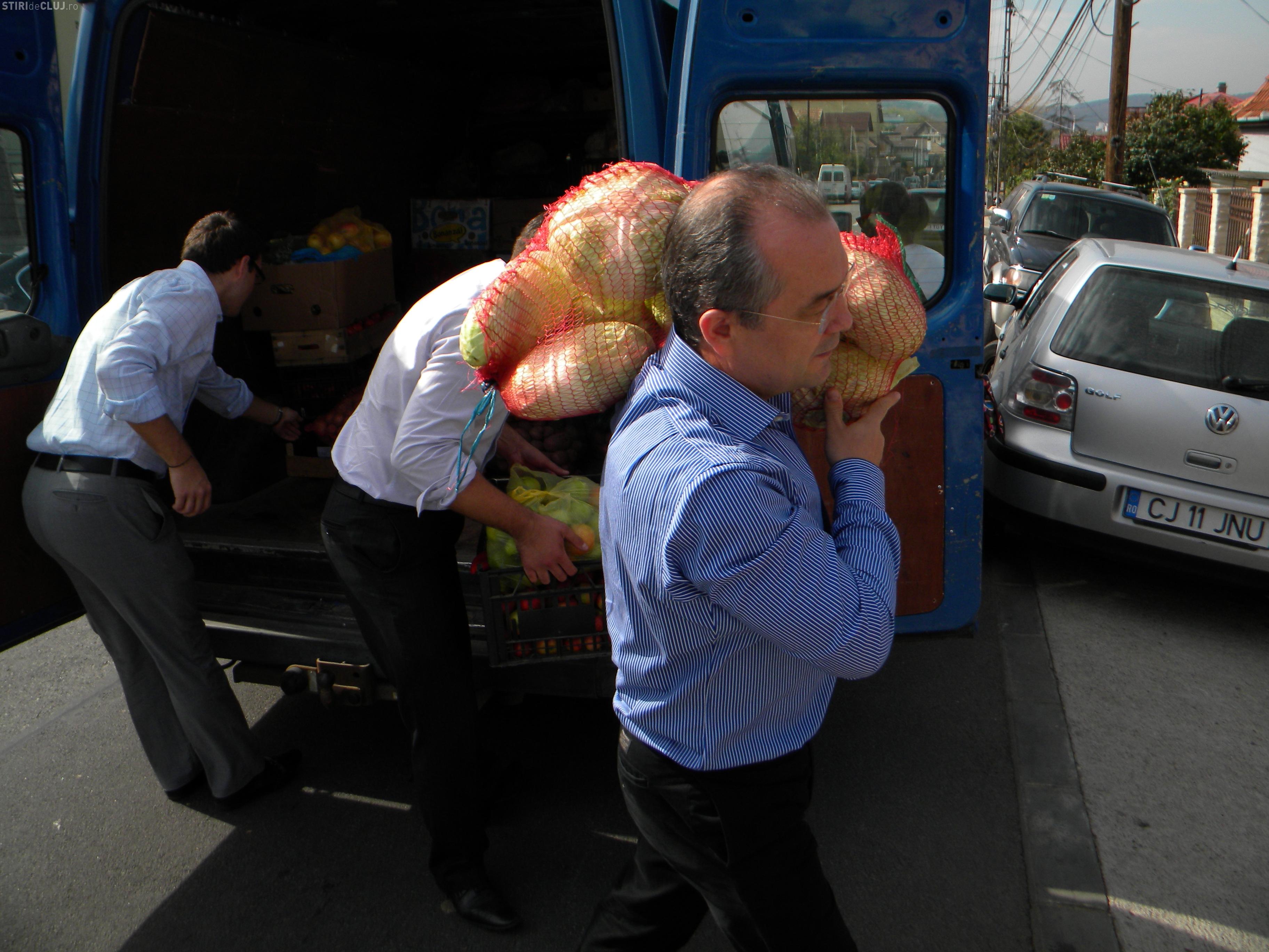 Primarul Emil Boc a ajutat la căratul sacilor cu legume. A dus în spate saci cu vinete, cartofi și fasole și chiar i-a îndemnat pe vecini să ajute.