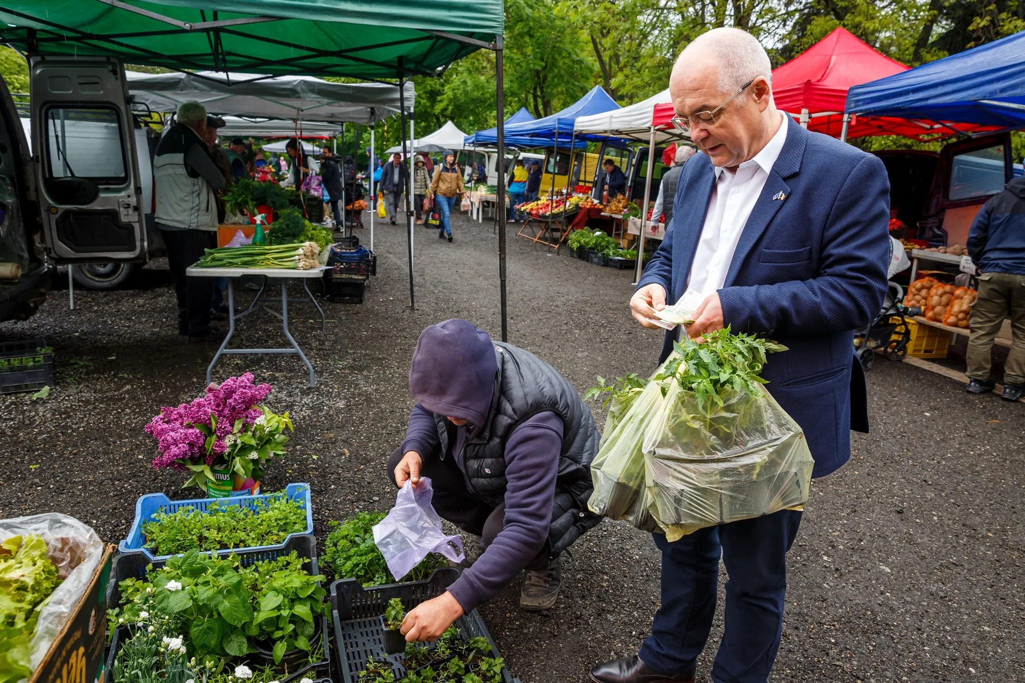 Emil Boc s-a afișat cumpărând ridichi și brânză de la piața volantă de lângă Cluj Arena și îi îndeamnă pe clujeni să facă la fel