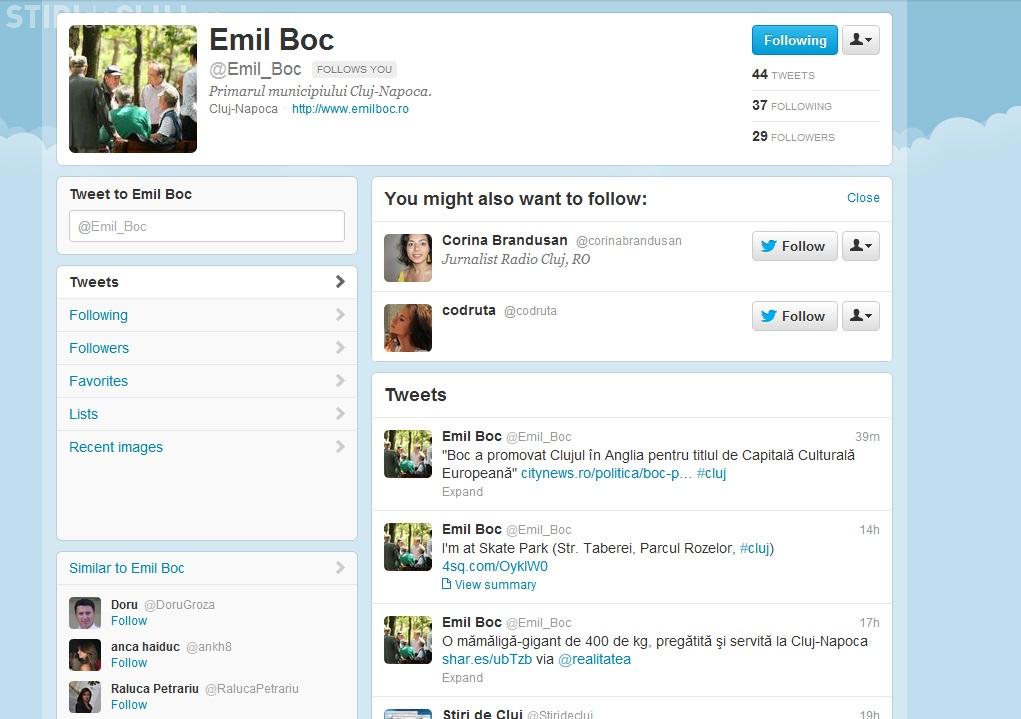 Primarul Clujului mai are un cont activ de Facebook, dar devine tot mai implicat și pe Twitter, unde postează, în principal, articolele care îl vizează.