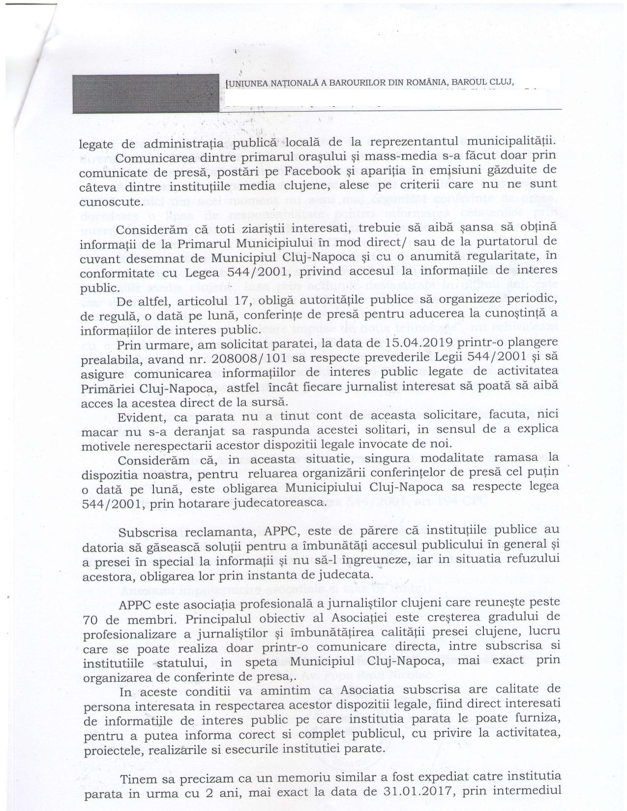 Asociația Profesioniștilor din Presă – Cluj (APPC) a dat în judecată Primăria Cluj-Napoca (dosarul 1749/117/2019), deoarece de aproape un an și jumătate nu a organizat nicio conferință de presă, primarul preferând să comunice ”unidirecțional” pe Facebook sau în alte ”medii” prietenoase.