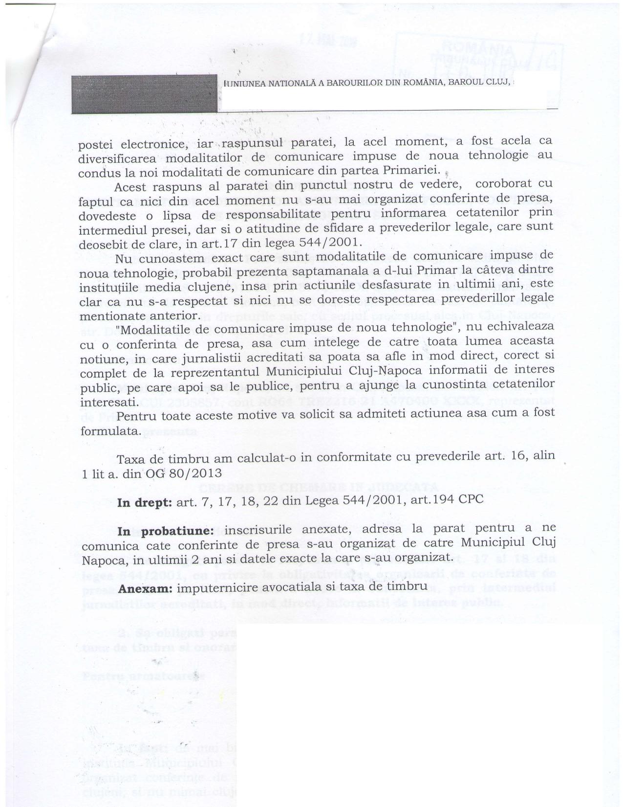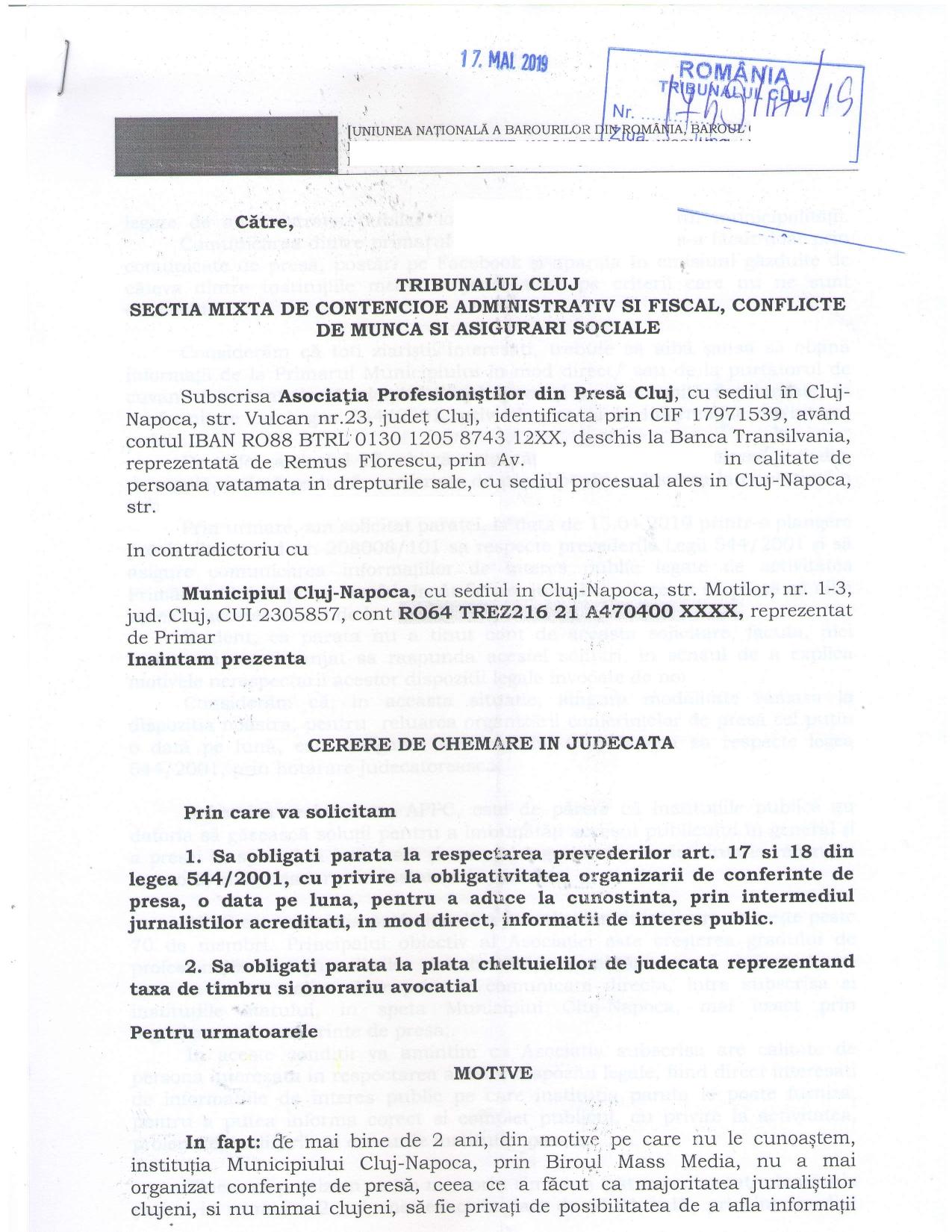 Asociația Profesioniștilor din Presă – Cluj (APPC) a inițiat vineri, 17 mai 2019, o acțiune în instanță prin care urmărește obligarea Primăriei Cluj-Napoca să organizeze conferințe de presă conform legii 544/2001, ”de regulă o dată pe lună”. Demersul survine în contextul în care cea mai recentă conferință de presă organizată de instituția menționată a avut loc în data de 11.12.2017, anunță APPC.