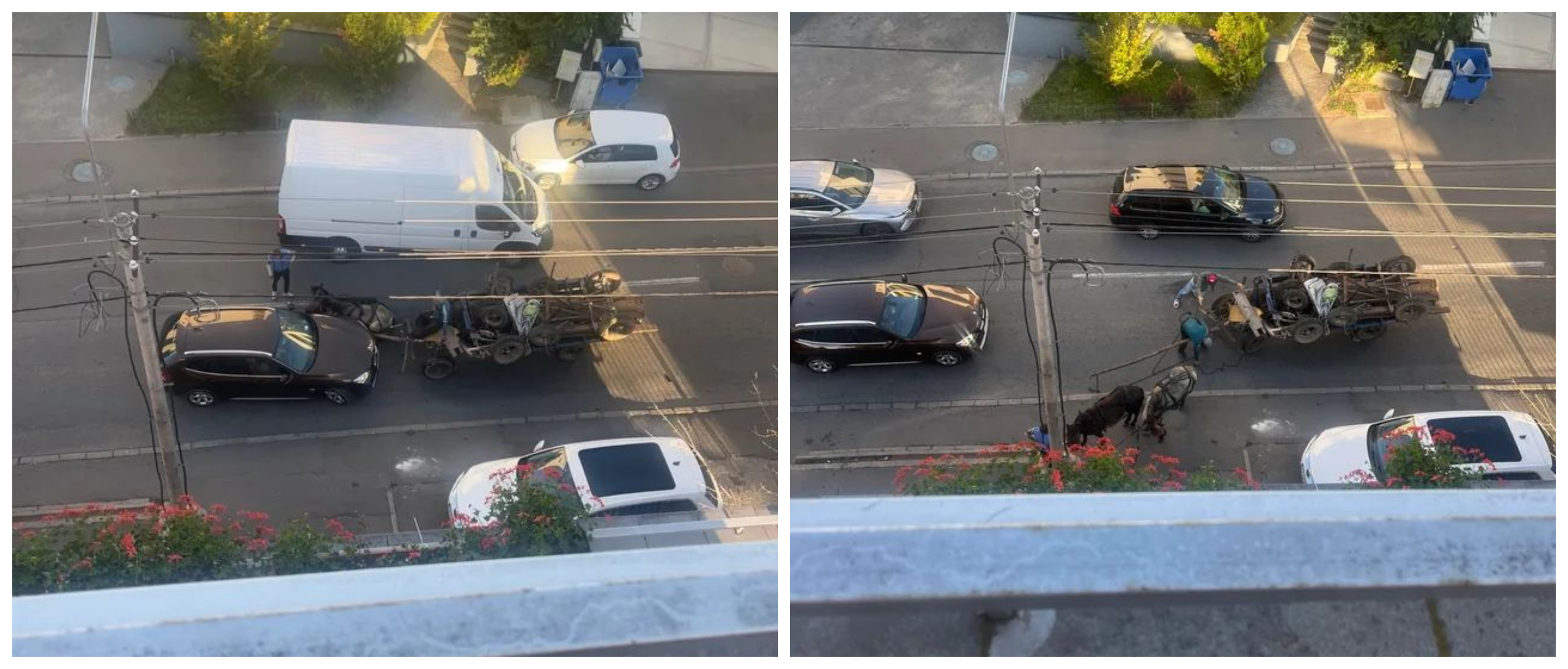 Episod absurd în Cluj-Napoca: Trafic blocat după ce o căruță a rămas pe mijlocul drumului, iar caii s-au așezat liniștiți pe trotuar FOTO