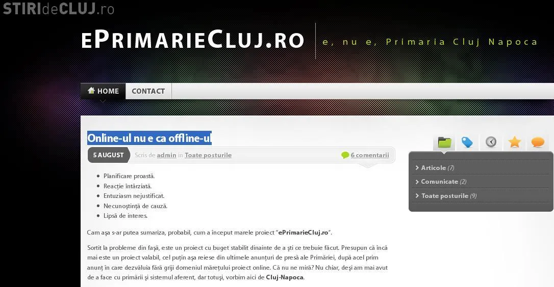 "Planificare proasta, reactie intarziata, entuziasm nejustificat, necunostinta de cauza si lipsa de interes", asa este caracterizat "marele proiect eprimarieCluj.ro", lansat de primarul Sorin Apostu cu mare tam-tam la sfarsitul lunii iulie, intr-un editorial postat pe site.