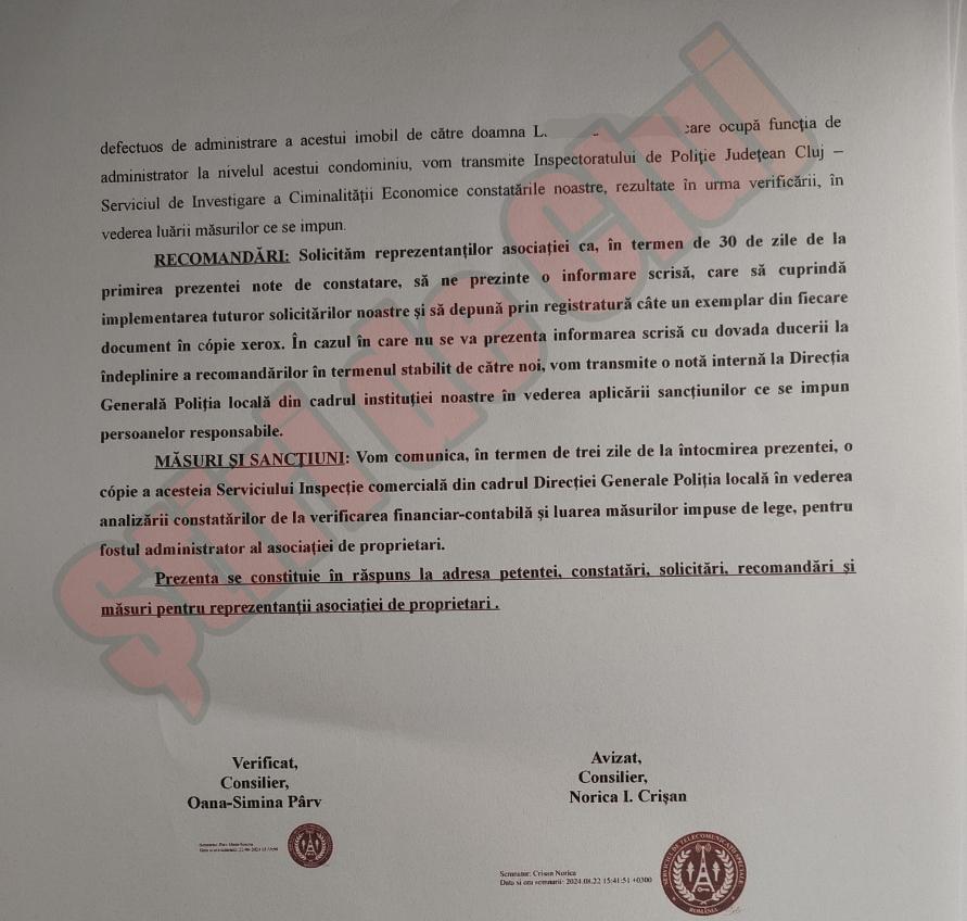 Din cele două asociații verificate de către serviciul nostru, am constatat că dna L. A.B nu și-a îndeplinit atribuțiile prevăzute de Legea nr. 196/2018, cu modificările și completările ulterioare, principalul element fiind că asociațiile verificate au fost somate de către furnizorii de utilități cu sistarea serviciilor, din cauza neefectuării plăților facturilor emise de către aceștia, în termenul prevăzut de lege de către administratorul de condominii.
