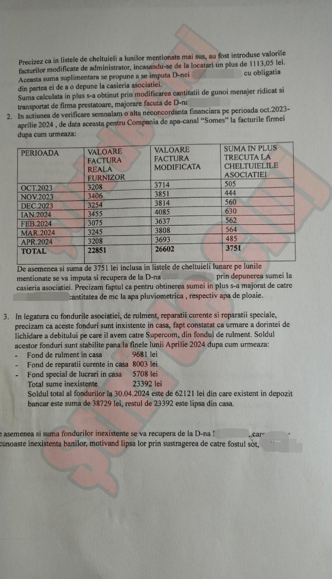De asemenea, în urma unor verificări amănunținte, s-a constatat că, timp de 7 luni, în perioada octombrie 2024 - aprilie 2024, administratorul asociației de proprietari de pe strada Clăbucet a umflat artificial facturile, cu aproximativ 4000 de lei.